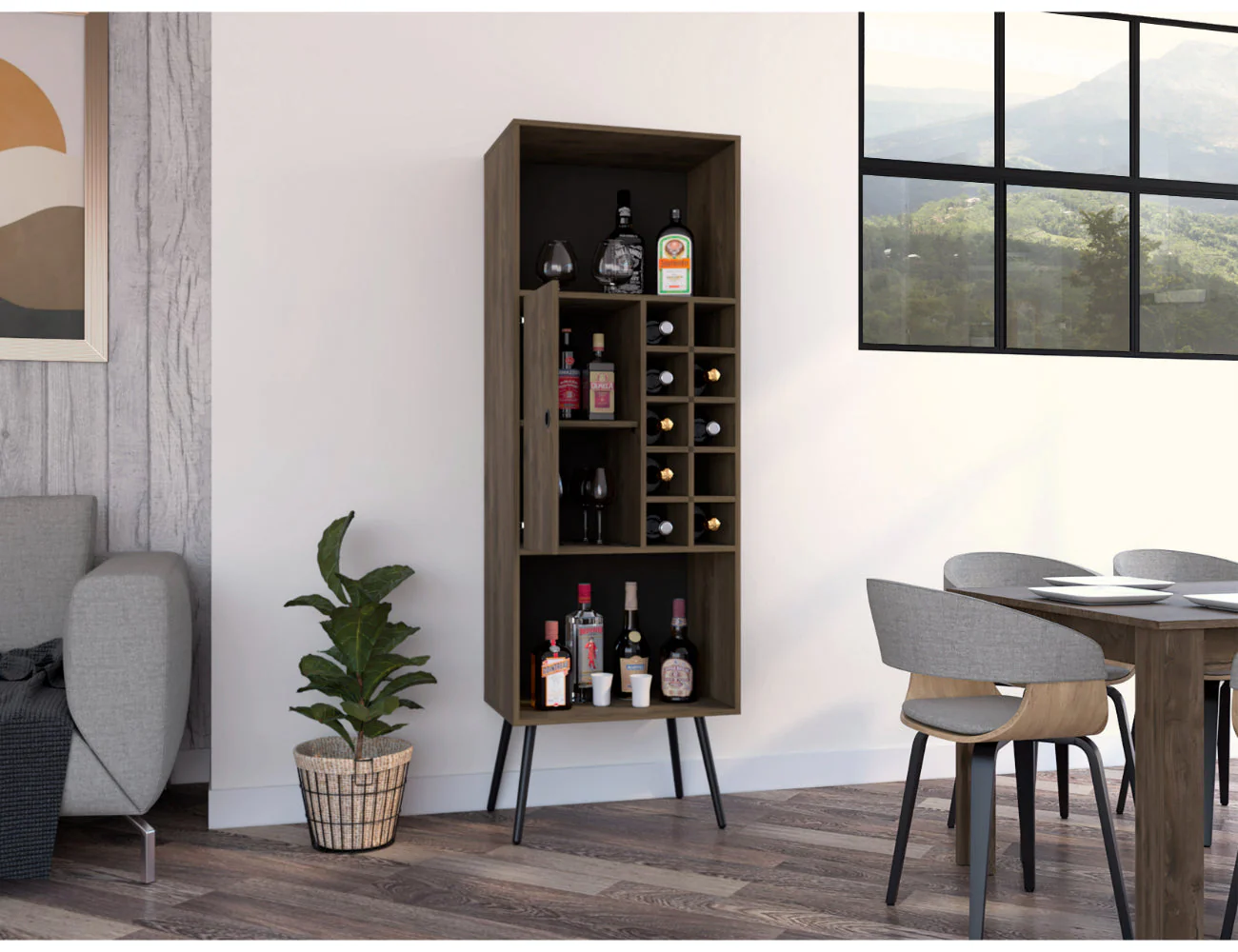 Bar, con espacio para guardar botellas de vino, espacio para almacenamiento y puerta abatible.