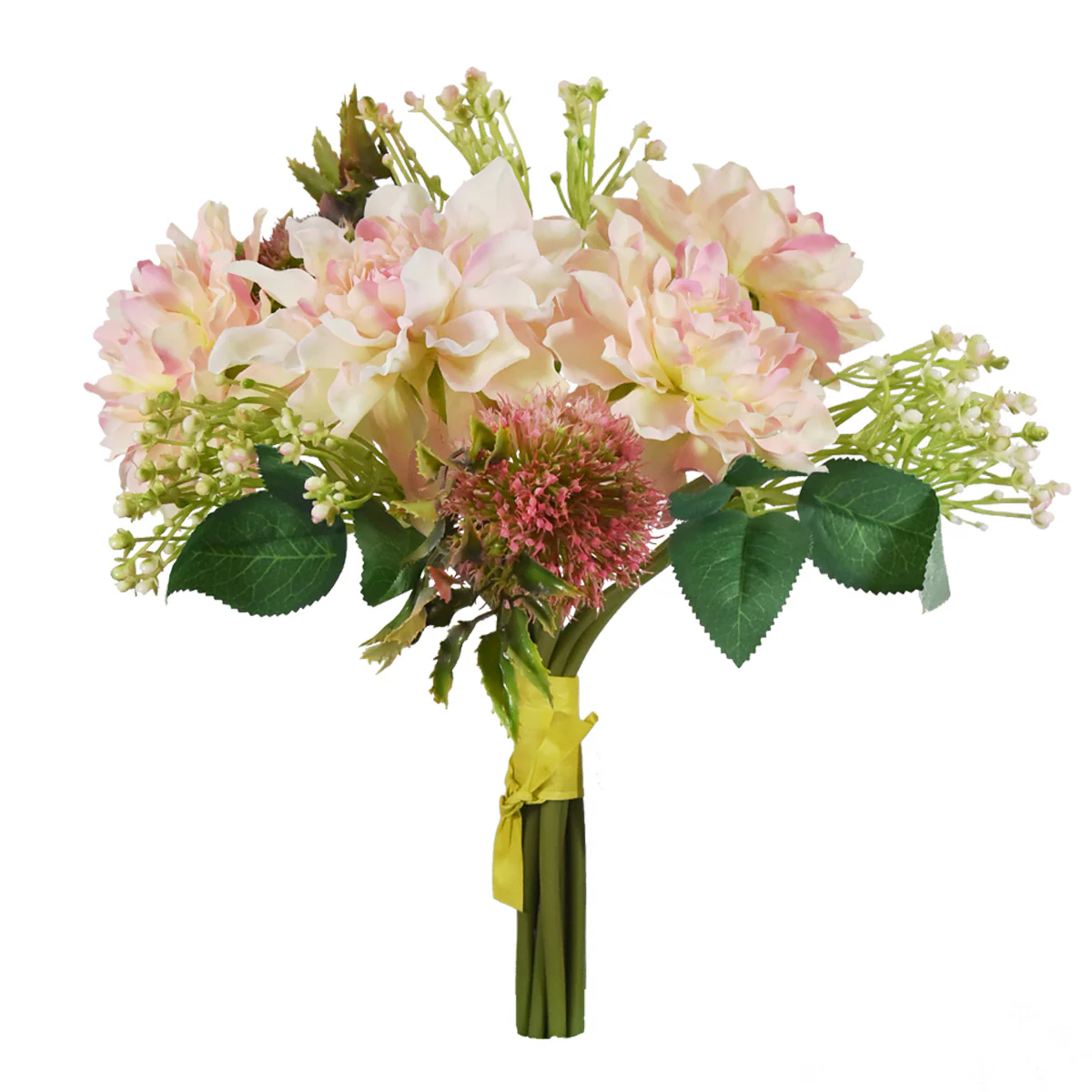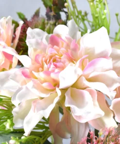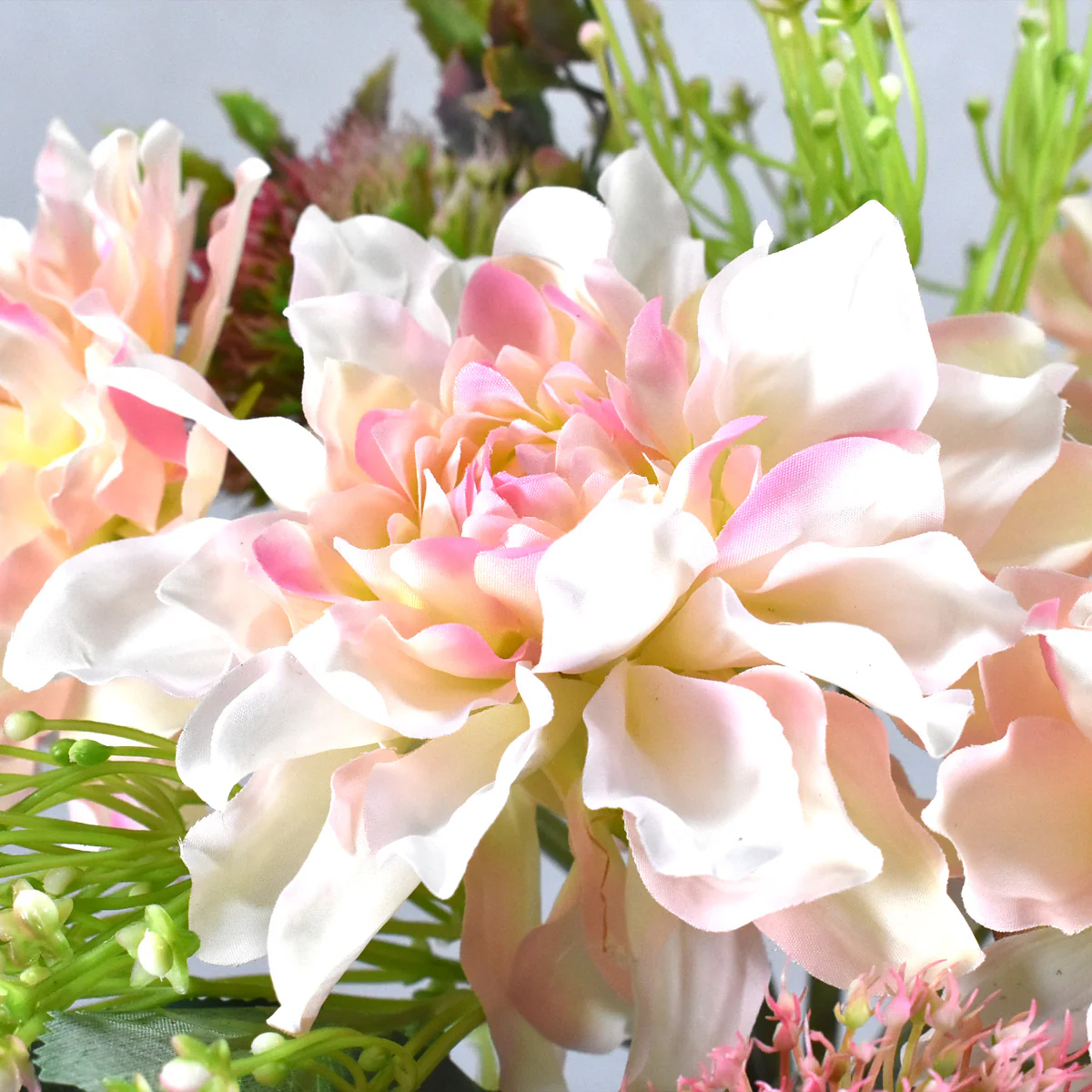 Ramo de dalias, acompañadas de hidrangeas, proteas y follajes surtidos. Cuentan con 4 flores de tela de calidad premium