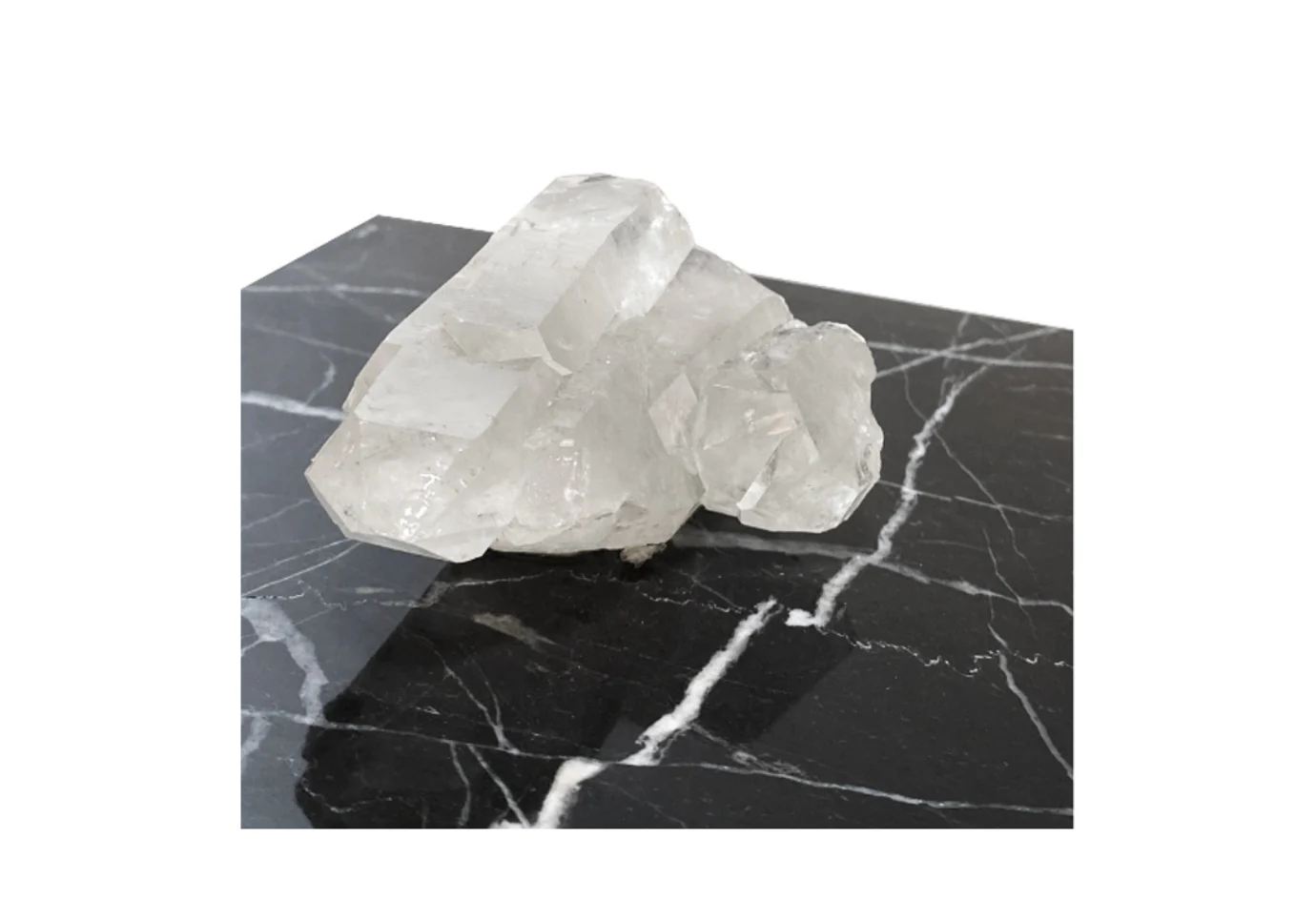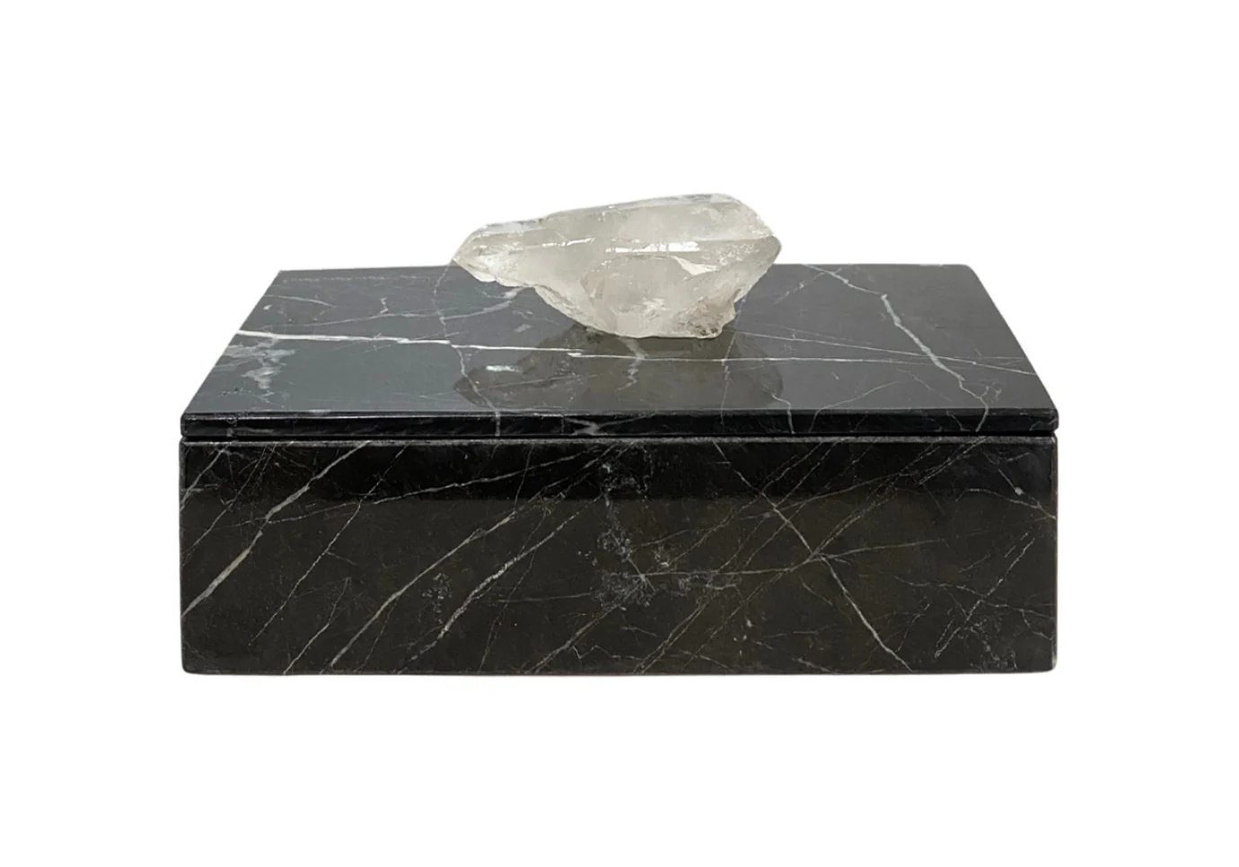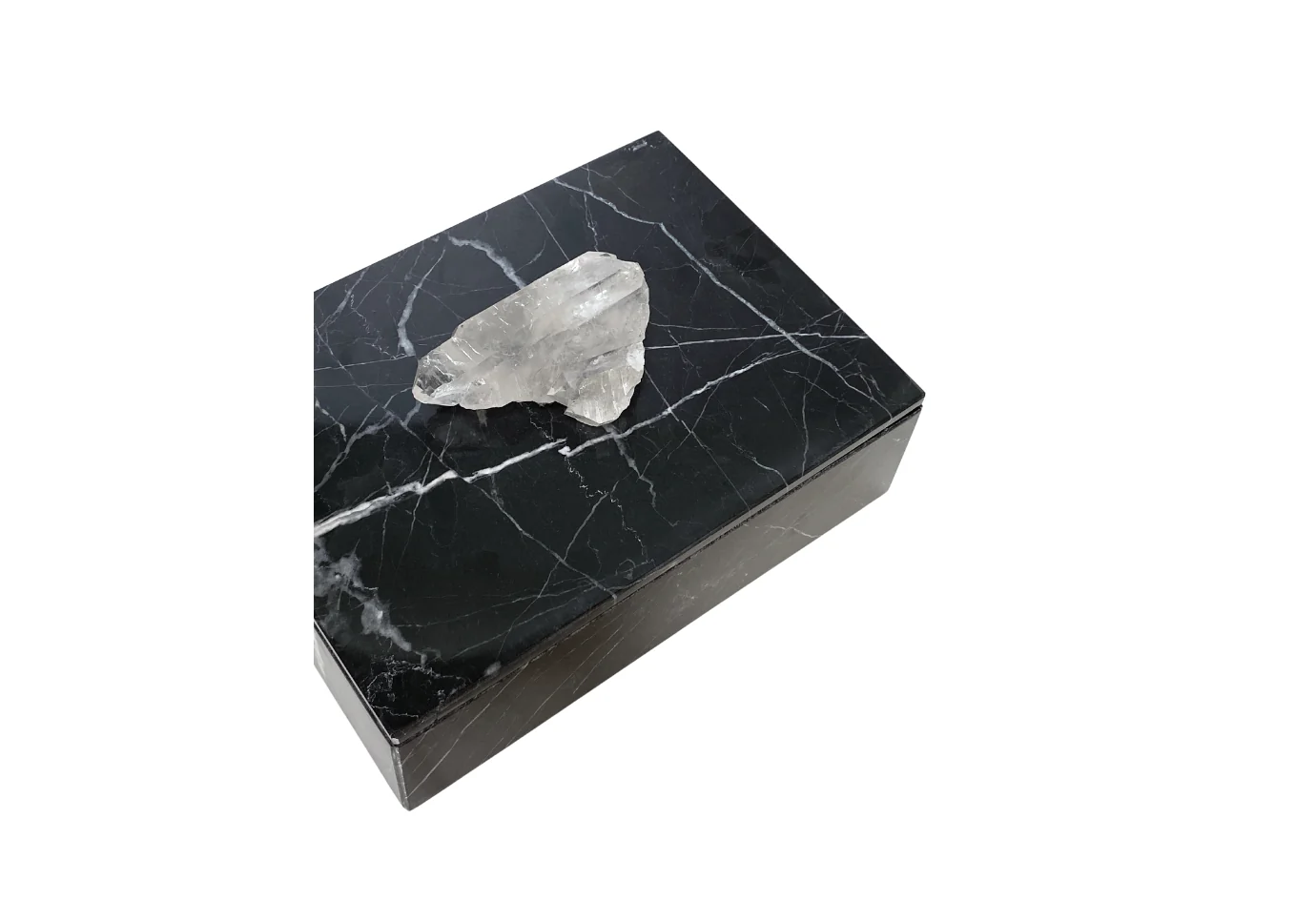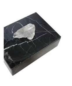 La caja con un detalle de cuarzo es un objeto de decoración exquisito que combina simplicidad y sofisticación de manera única. Su diseño se centra en una elegante caja de color negro con toques blancos y una piedra de cuarzo posada en la tapa da un toque de estilo.