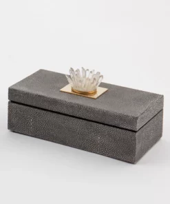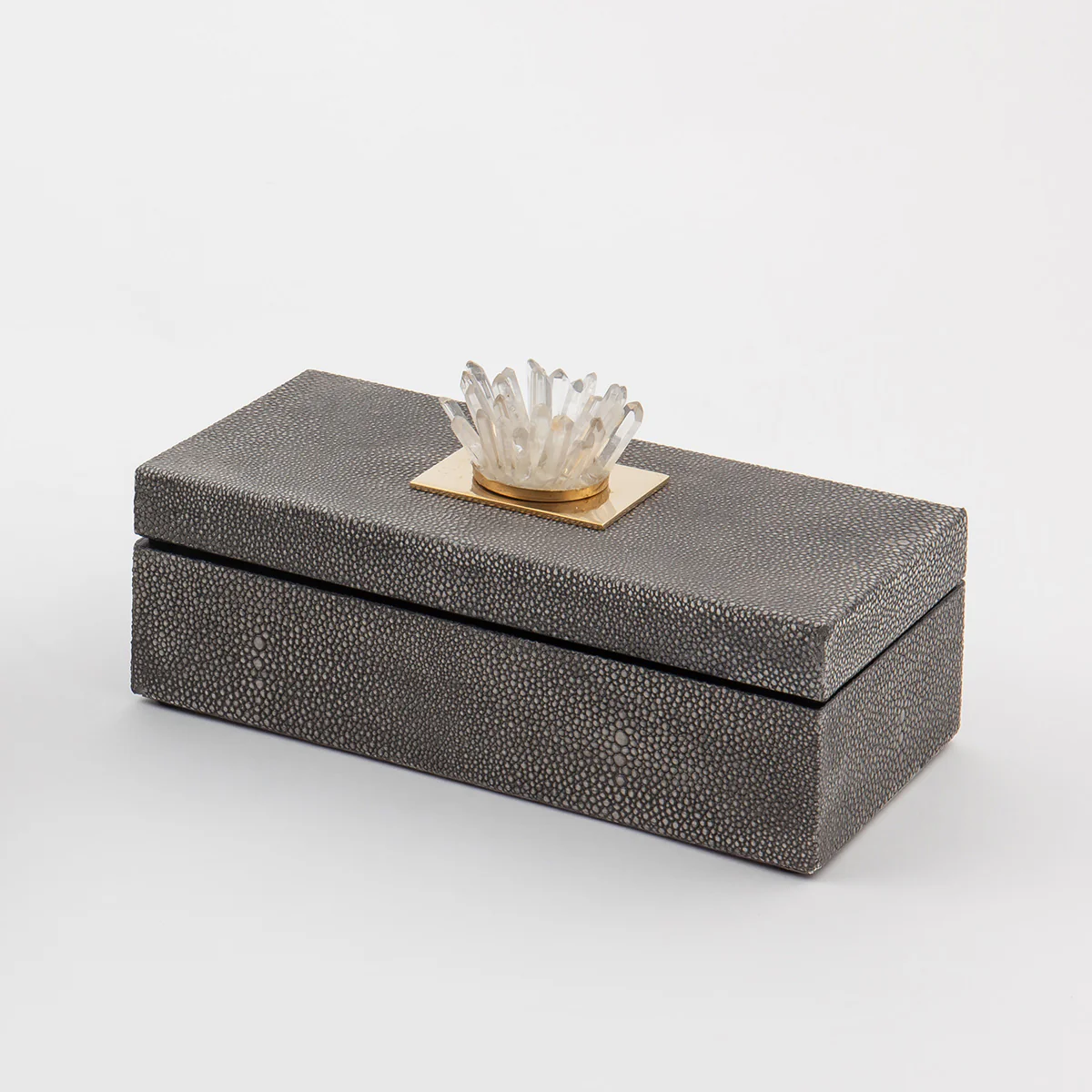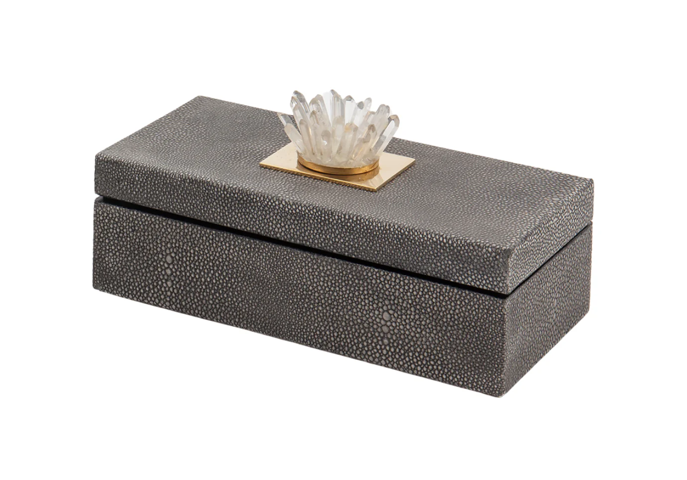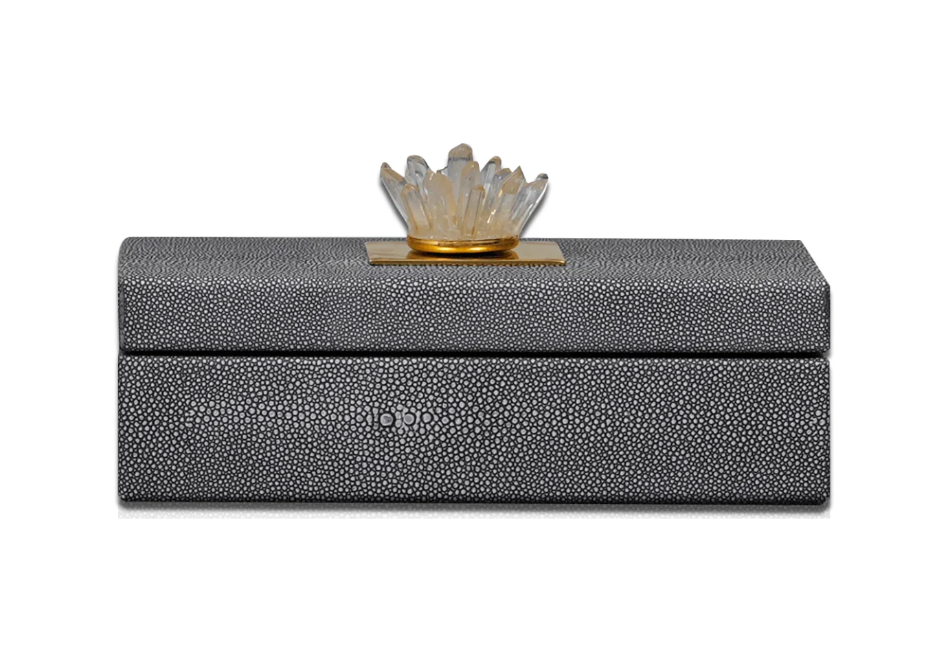Caja rectangular de vinipiel gris con detalle dorado y cuarzo transparente.