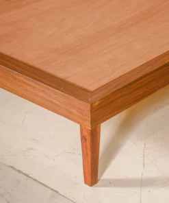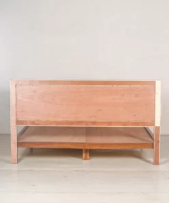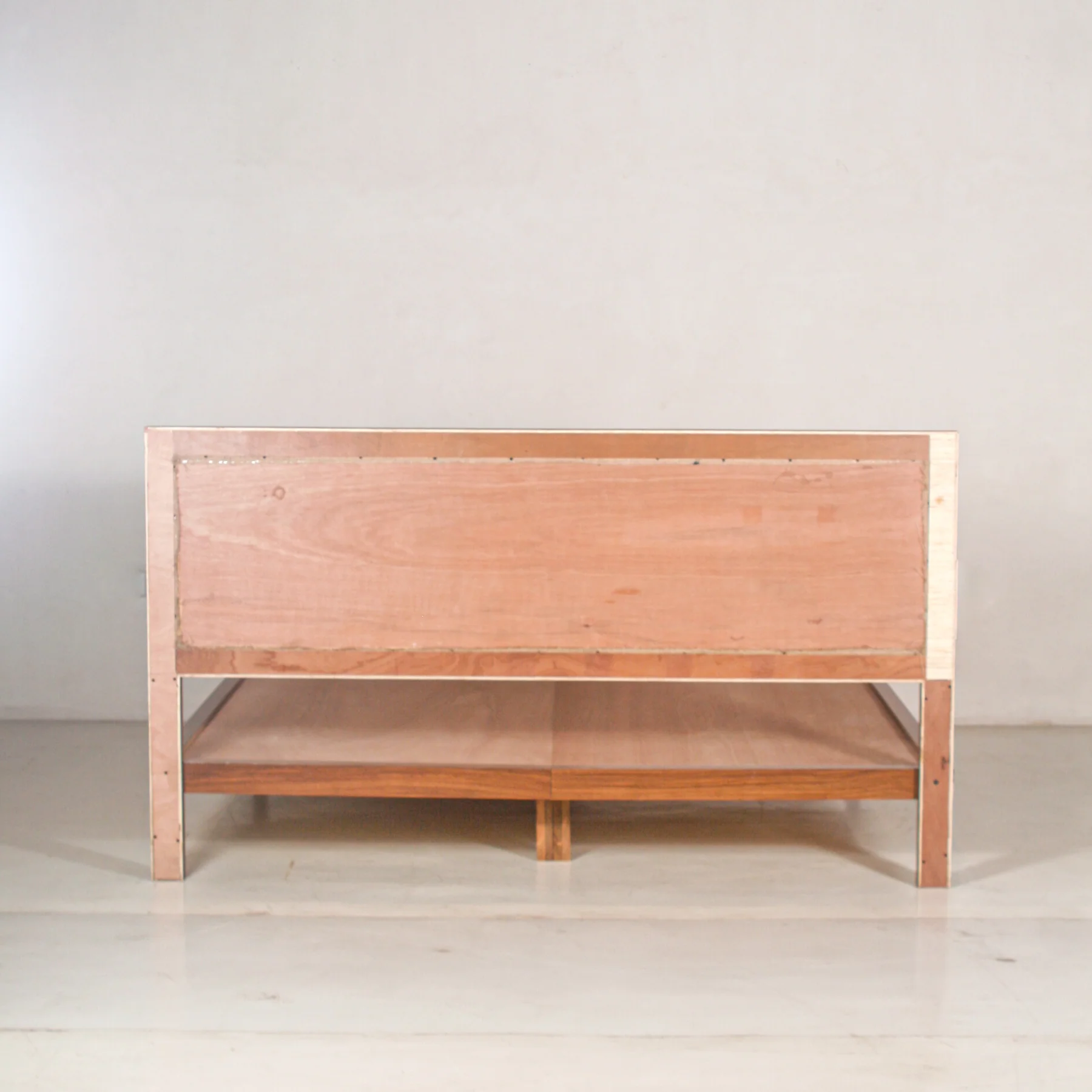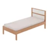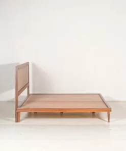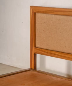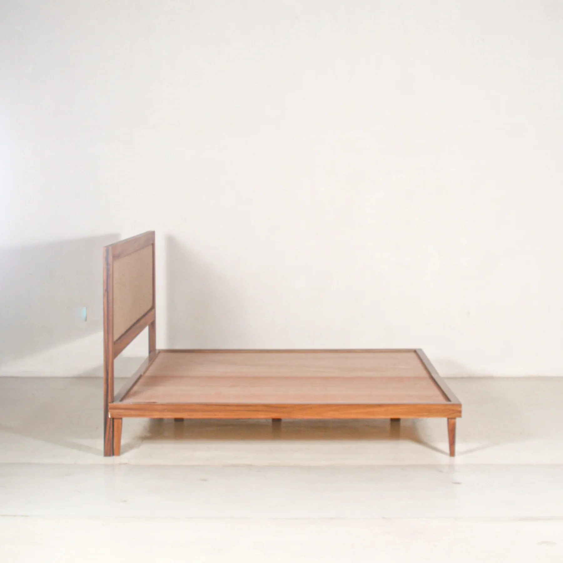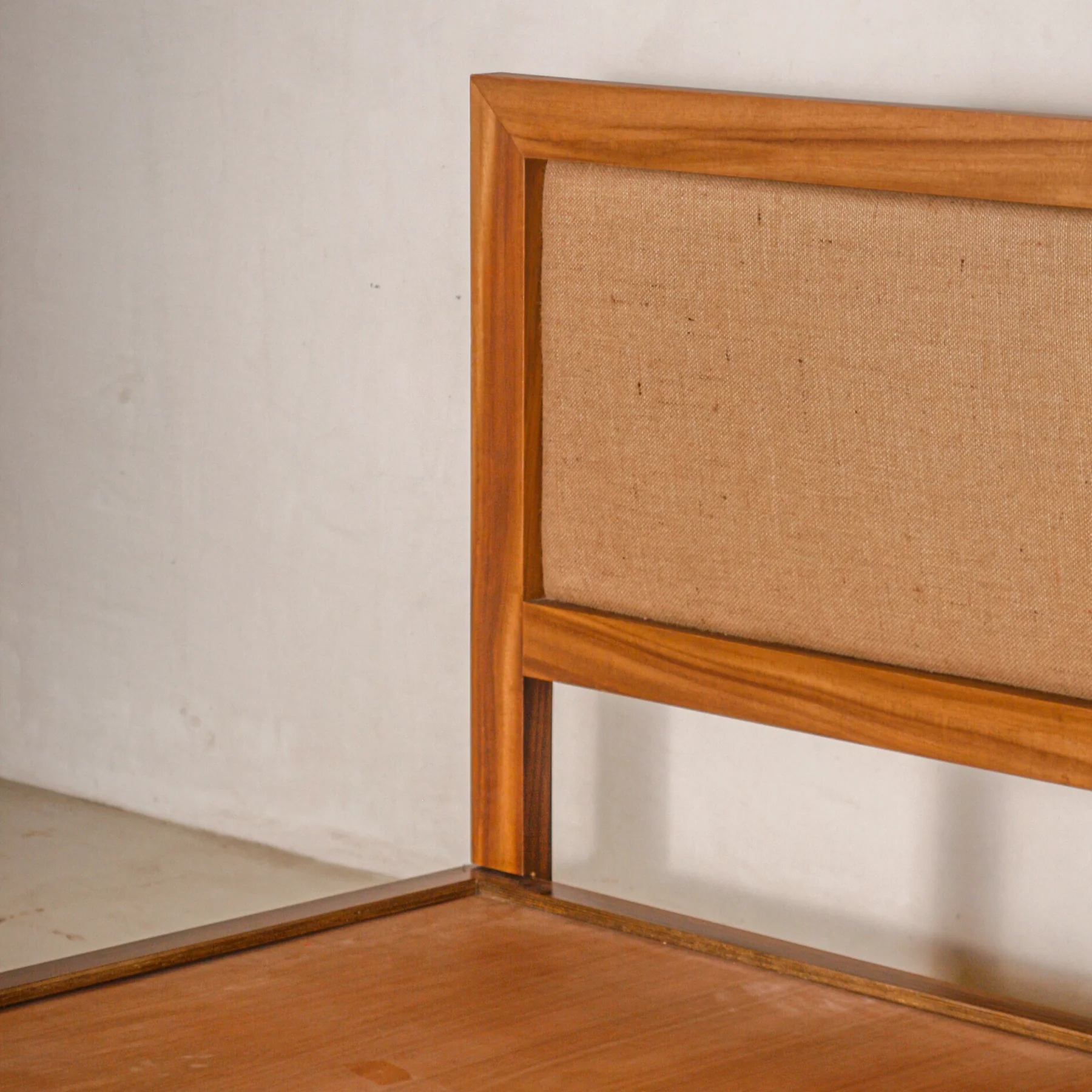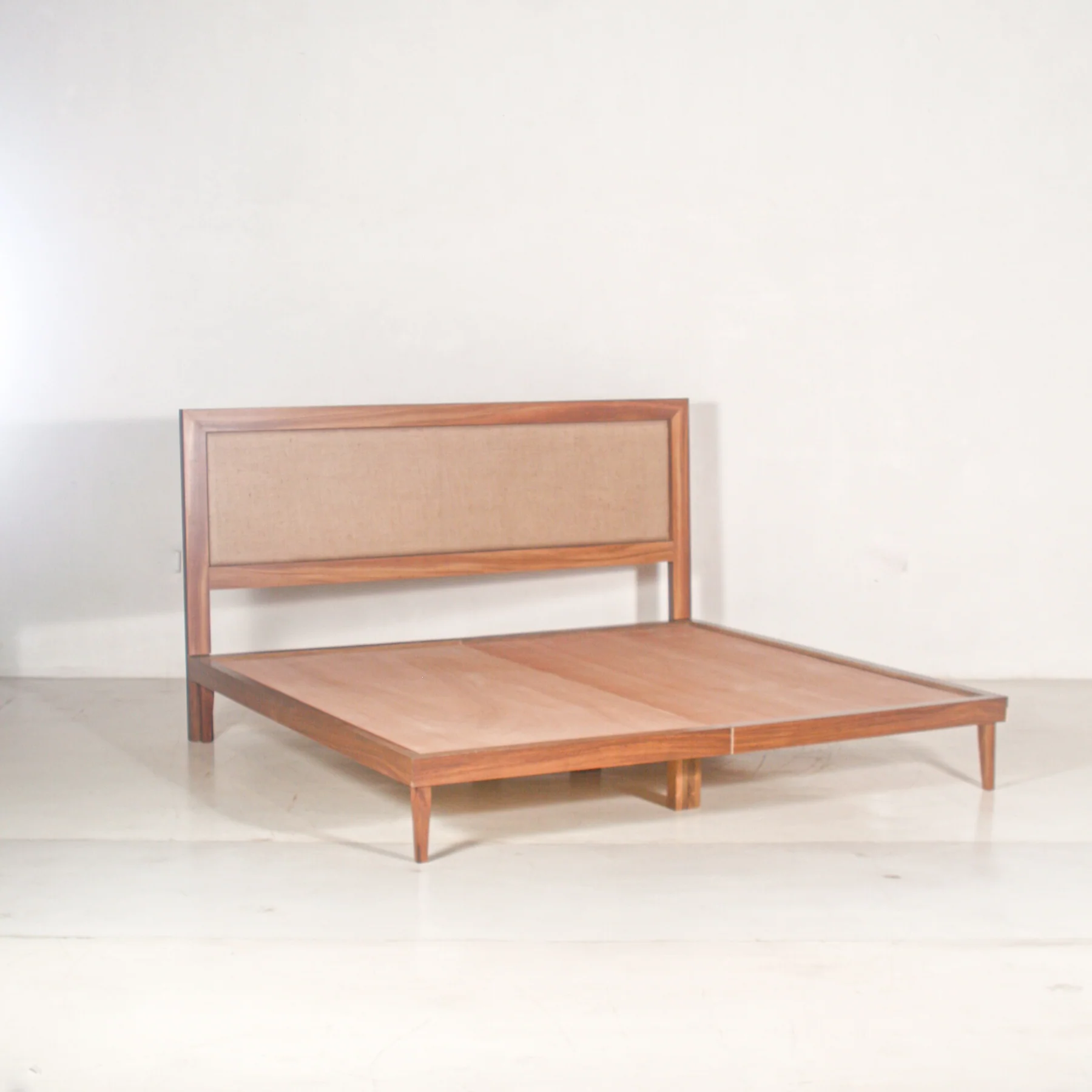 Cama fabricada en triplay enchapado de parota. Cabecera tapizada en yute.