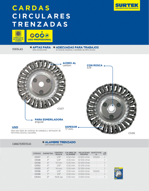 Carda circular trenzada alambre delgado 4″ x 0.35 mm con rosca M14 SURTEK.