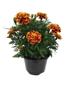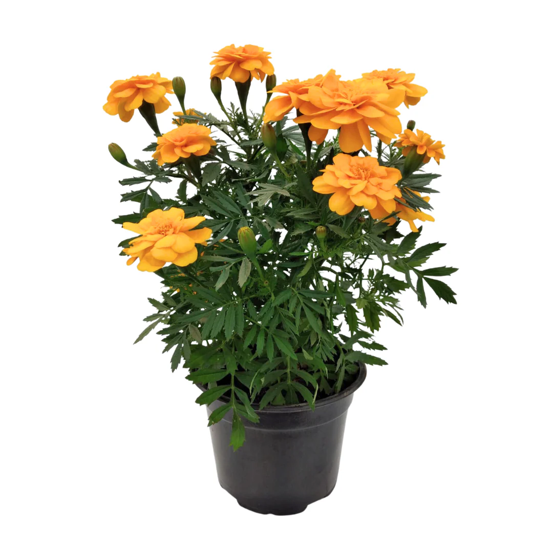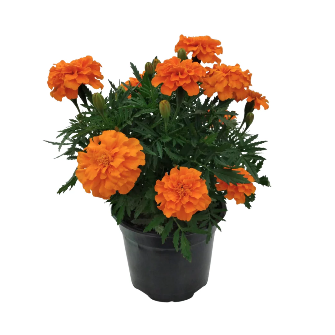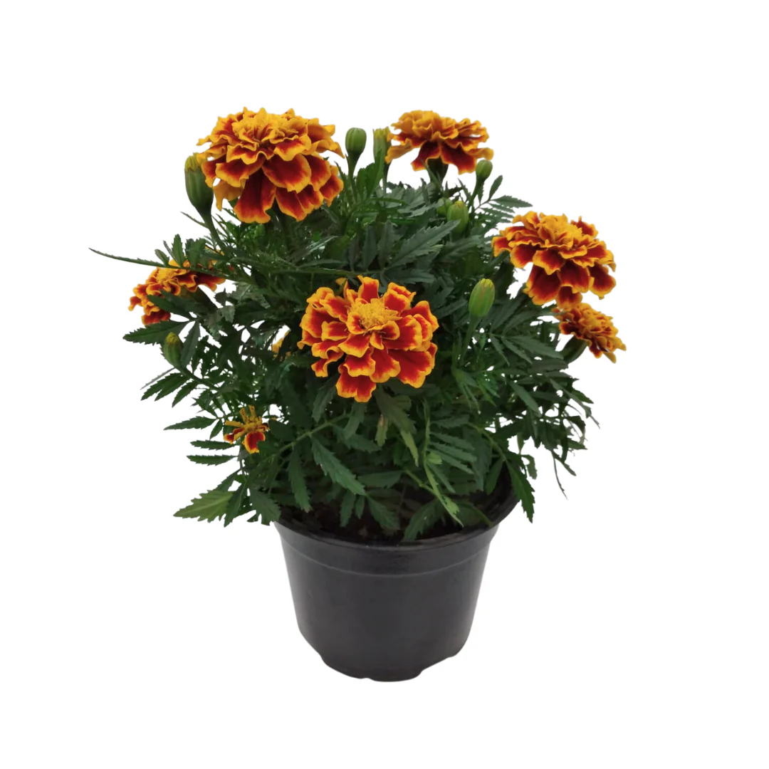 Flor de cempasúchil enano en maceta de 6 pulgadas y 3 tonos de color, naranja, amarillo y jaspeado.