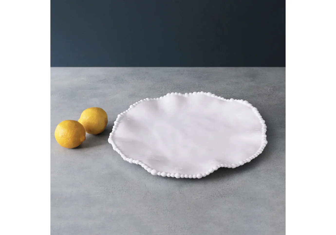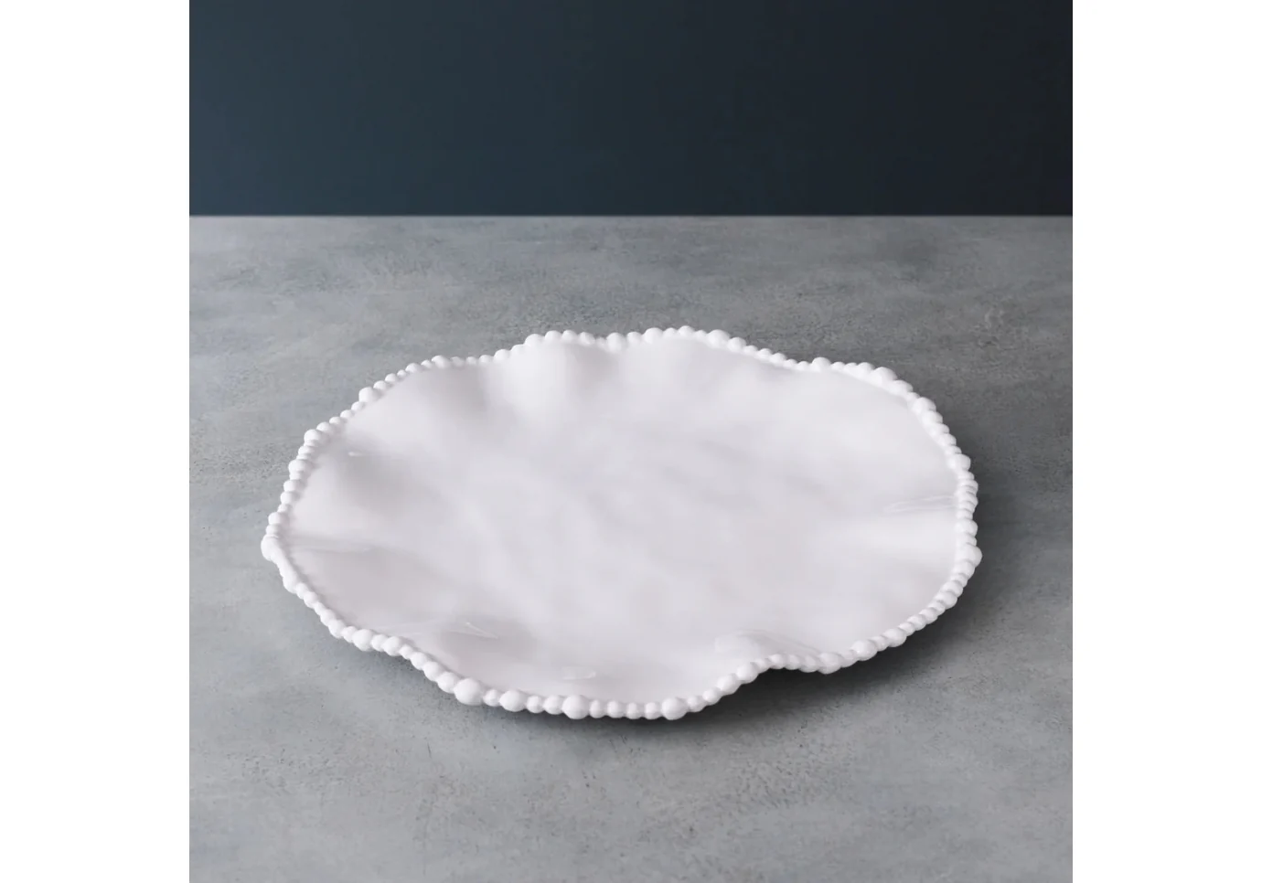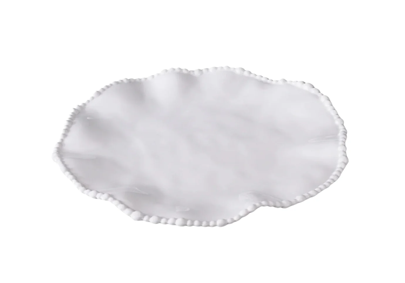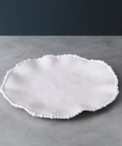 La charola extendida es una pieza fundamental para tú vajilla diseñado para servir de soporte y realzar la presentación de otros platos. De color blanca y de manera irregular mantiene una orilla ondeada aperlada.