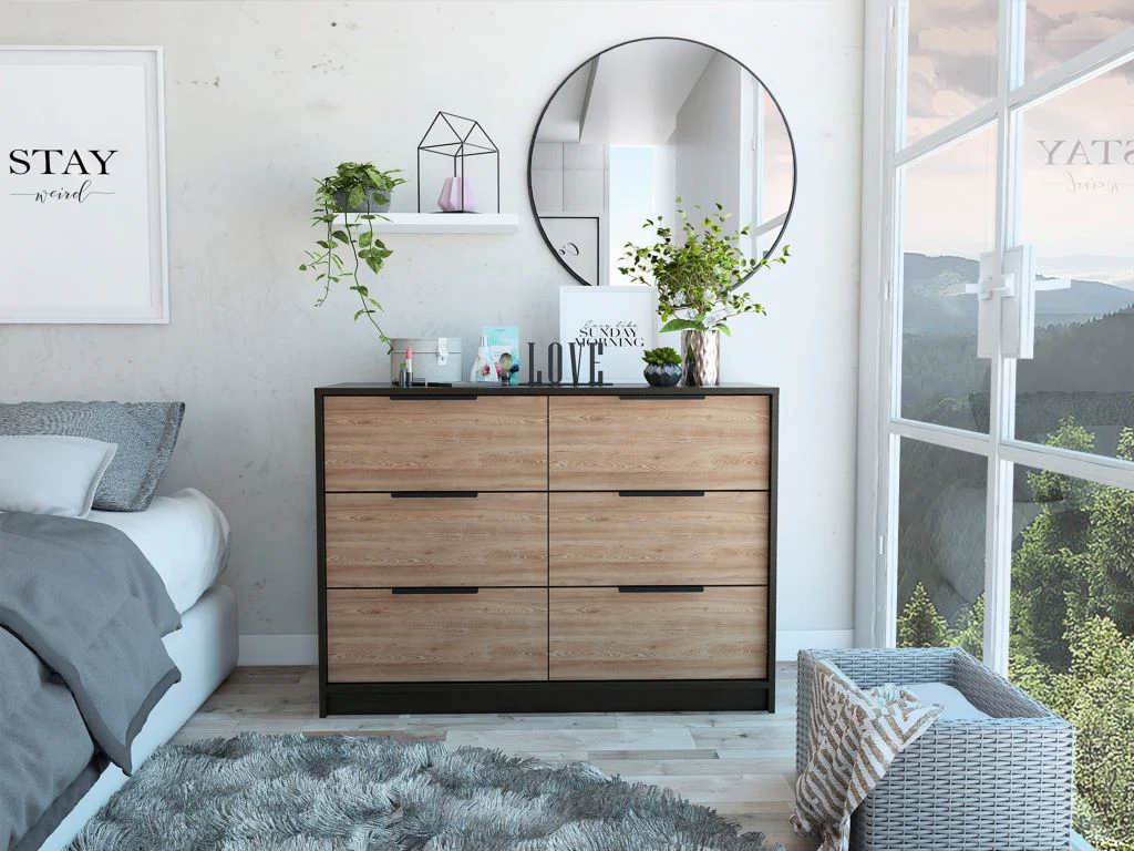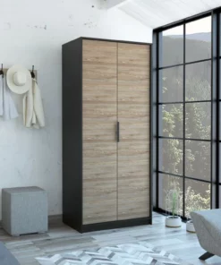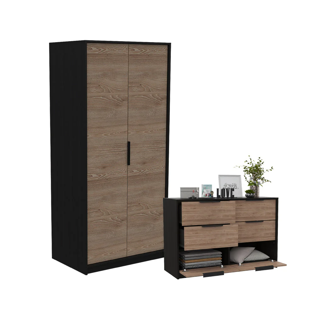 Combo, incluye Closet, con 1 tubo cromado para colgar ropa, 2 puertas batientes con manijas, y variedad de entrepaños y Organizador, con 4 cajones multiusos deslizables con manijas negras, 2 puertas abatibles en la parte inferior.