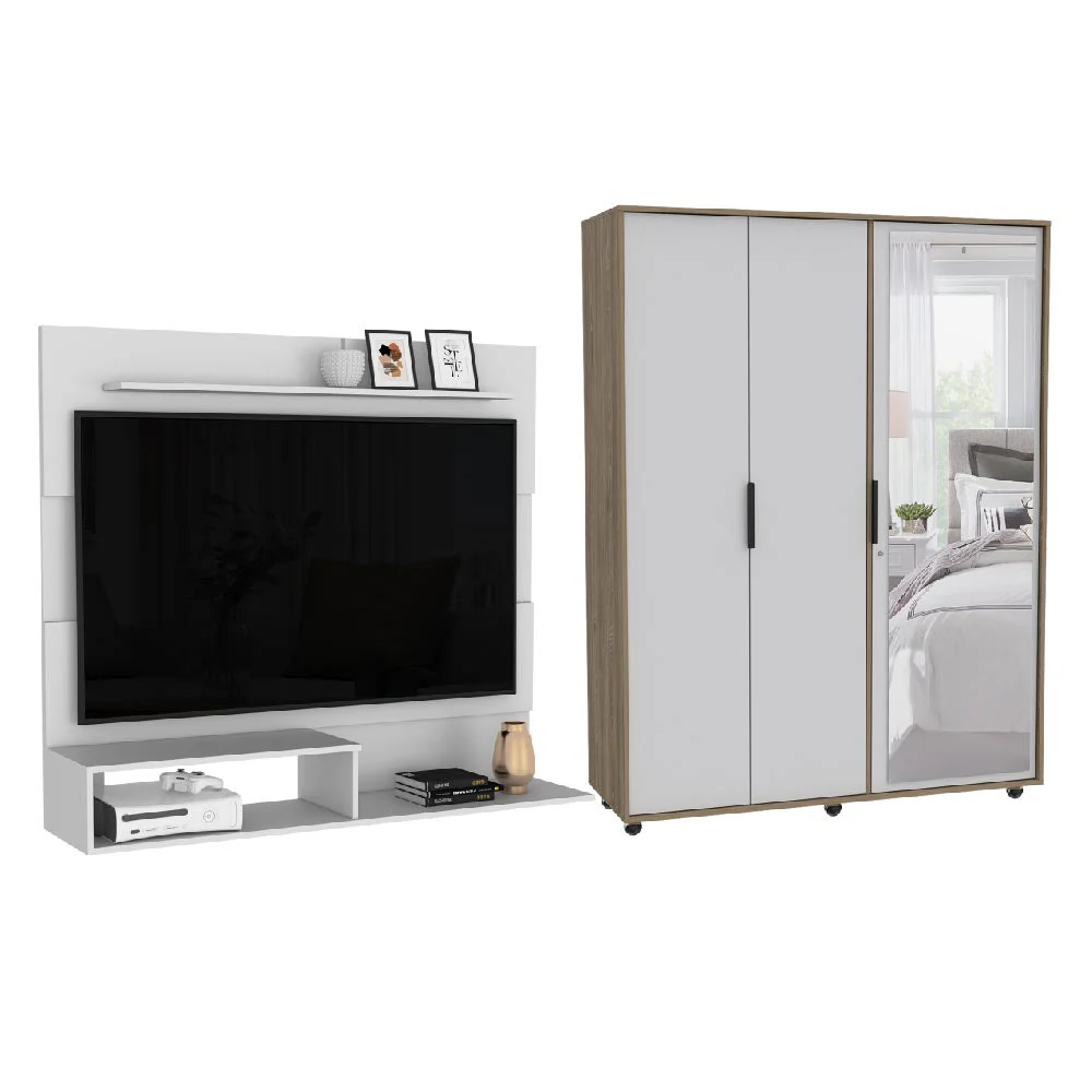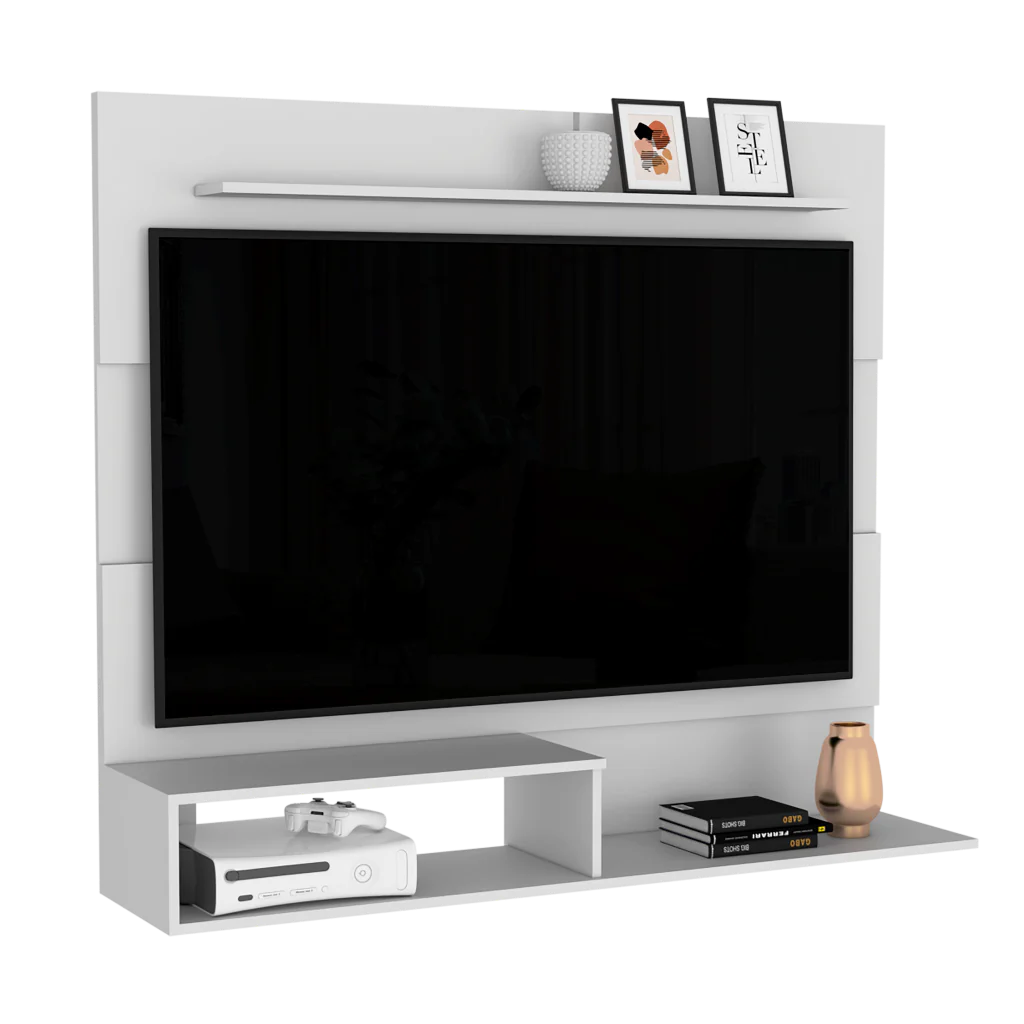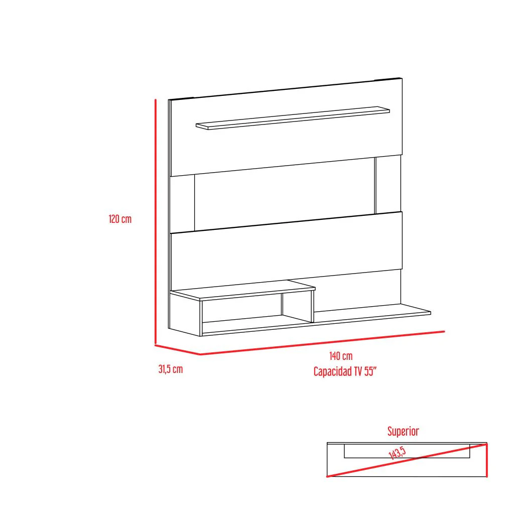 Panel para TV, múltiples entrepaños y superficies para ubicar objetos.