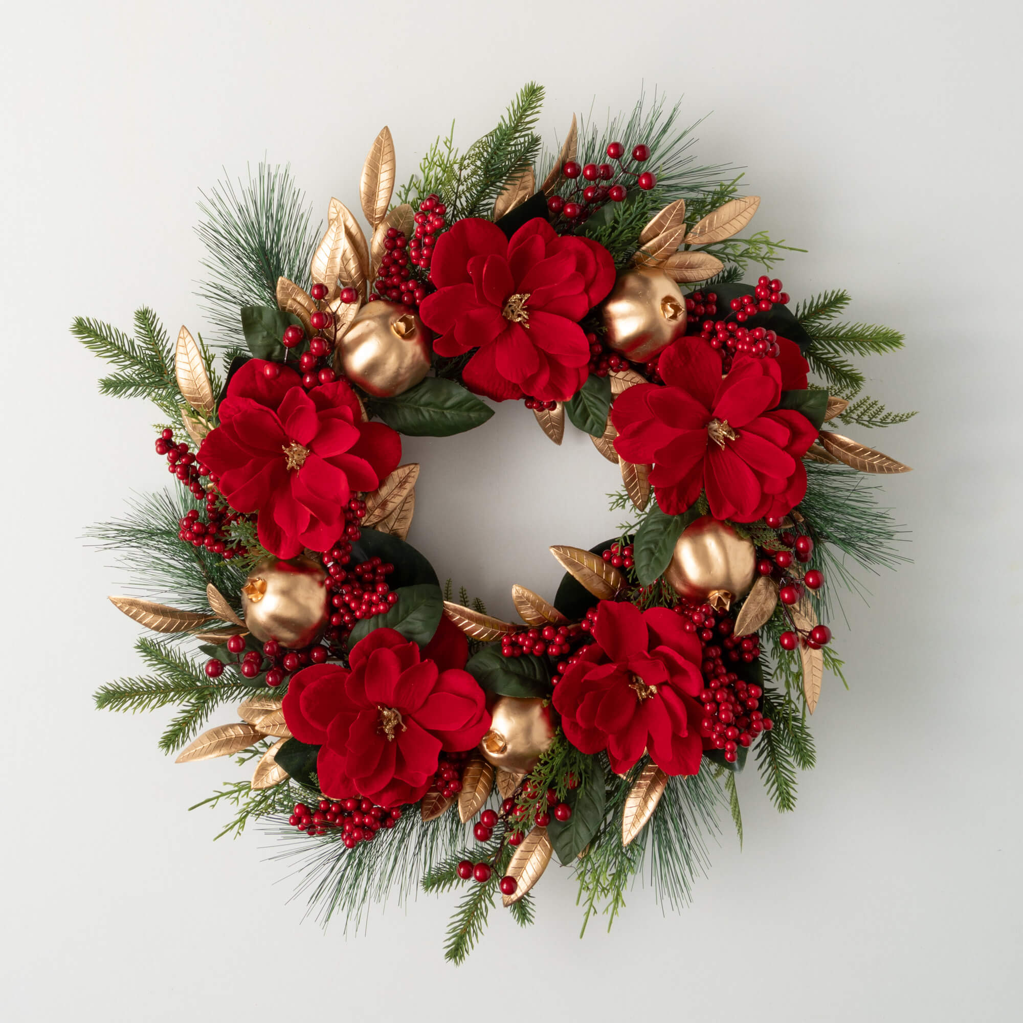 CORONA DE MAGNOLIAS ROJAS CON GRANADAS DORADAS MED:66 CM