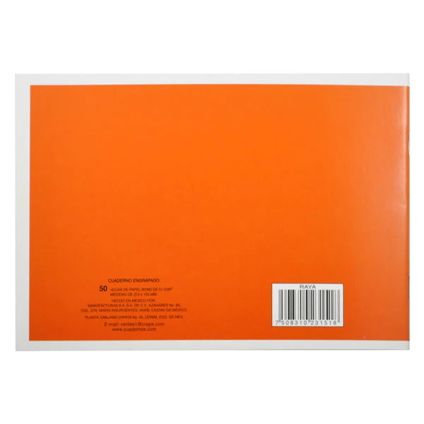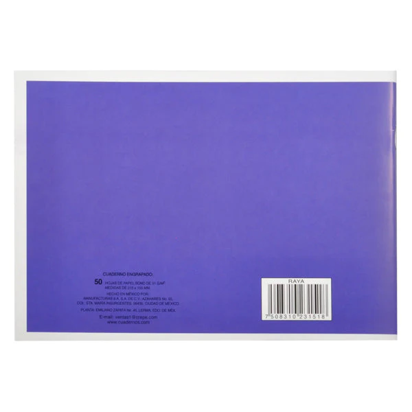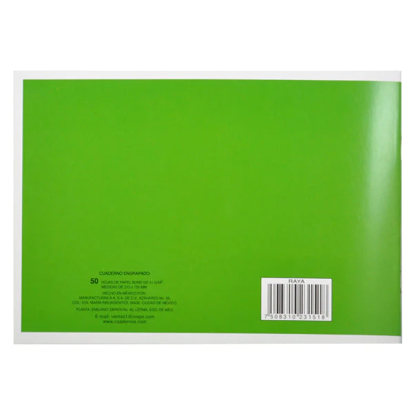 Cuaderno modelo italiano engrapado, con 50 hojas de raya; favor de seleccionar de la lista desplegable el color de su preferencia en base a las fotografías, en caso contrario se le mandará de aquel que tengamos existencia.