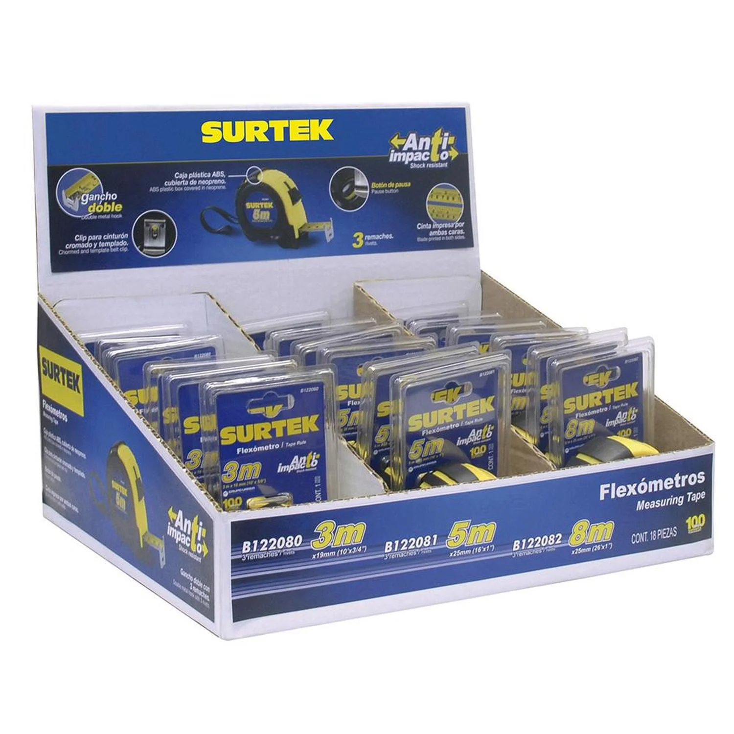 MARCA: Surtek DESCRIPCION DEL PRODUCTO: -Caja despachadora de flexómetros Anti Impacto-Gancho con 3 remaches-Gancho doble-Botón de pausa de activación rápida-Sistema con amortiguador ESPECIFICACIONES TECNICAS: CONTENIDO DEL PAQUETE: Despachador 18 flexo mix STK GARANTIA: Sin garantía ALTO EN CM: 19 LARGO EN CM: 35 FONDO EN CM: 41 PESO EN KG: 5.601
