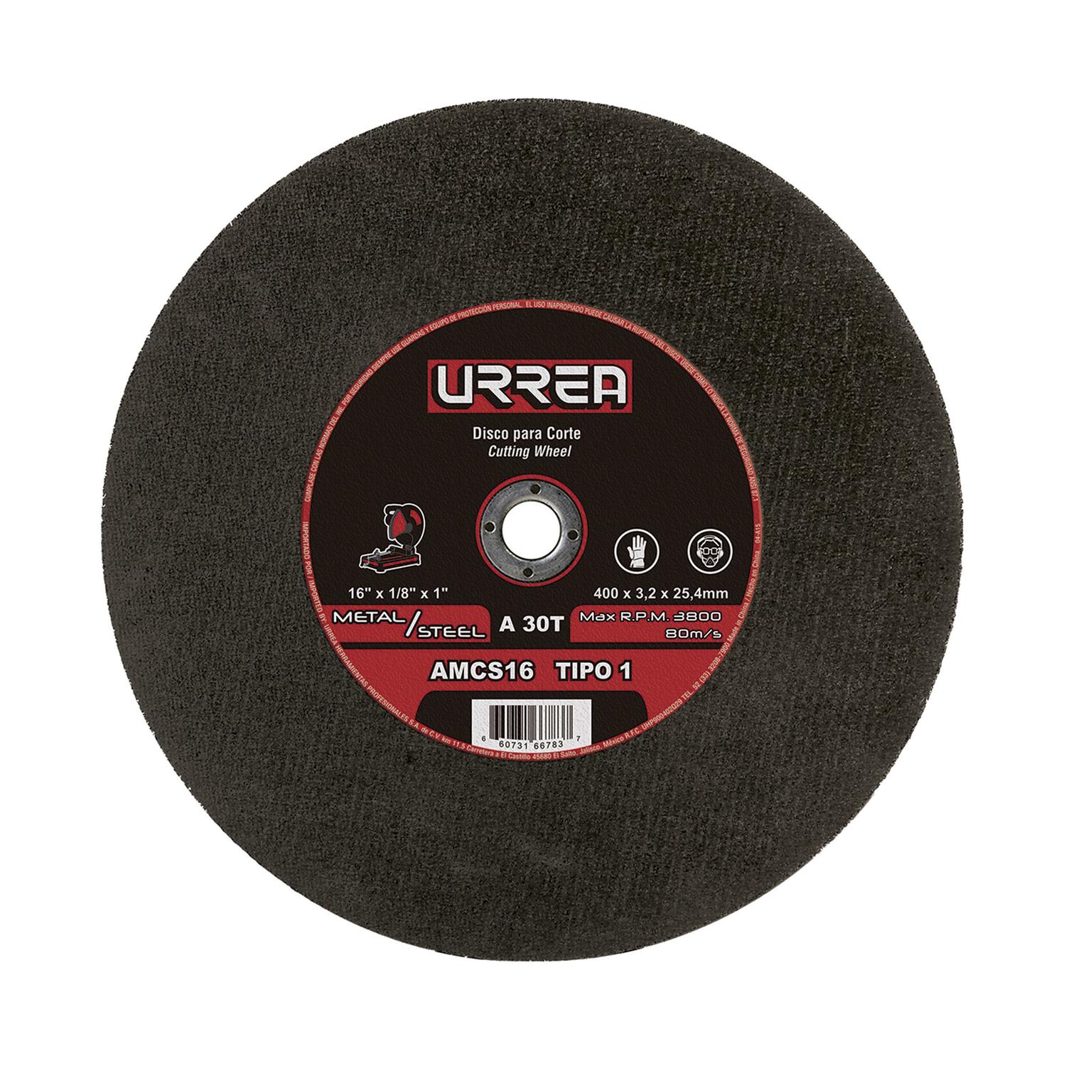 MARCA: Urrea DESCRIPCION DEL PRODUCTO: -Disco abrasivo tipo 1 para metal 16″1/8″x1″-Uso general-Óxido de aluminio ESPECIFICACIONES TECNICAS: -Aplicación: Para Metal-Centro: 1″-Diámetro: 16″-Grano: 30-Grosor: 1/8″-Mallas: 2-Rpm: 3800 Rpm-Tipo: Tipo 1-Uso: Materiales Huecos-Precio De Venta Libre: Si CONTENIDO DEL PAQUETE: Disco t/1 metal16x1/8″. GARANTIA: ALTO EN CM: 0.3 LARGO EN CM: 40 FONDO EN CM: 40 PESO EN KG: 0.976