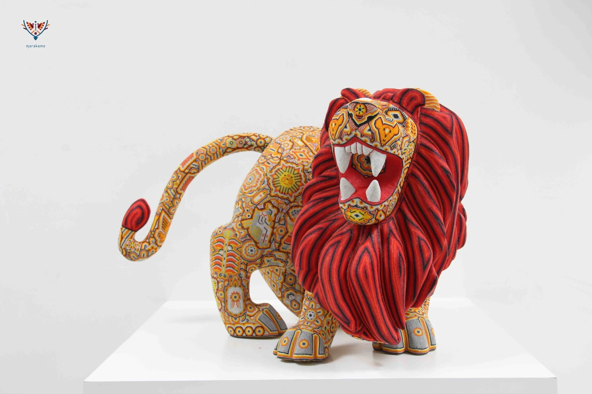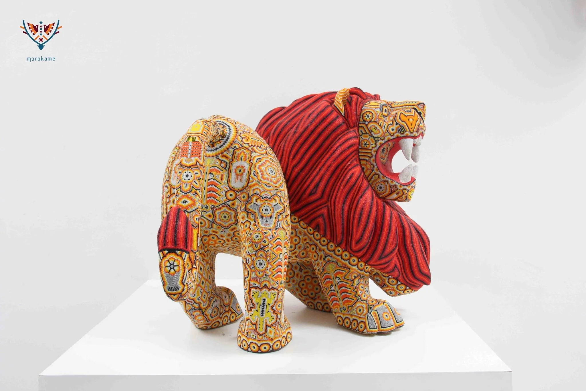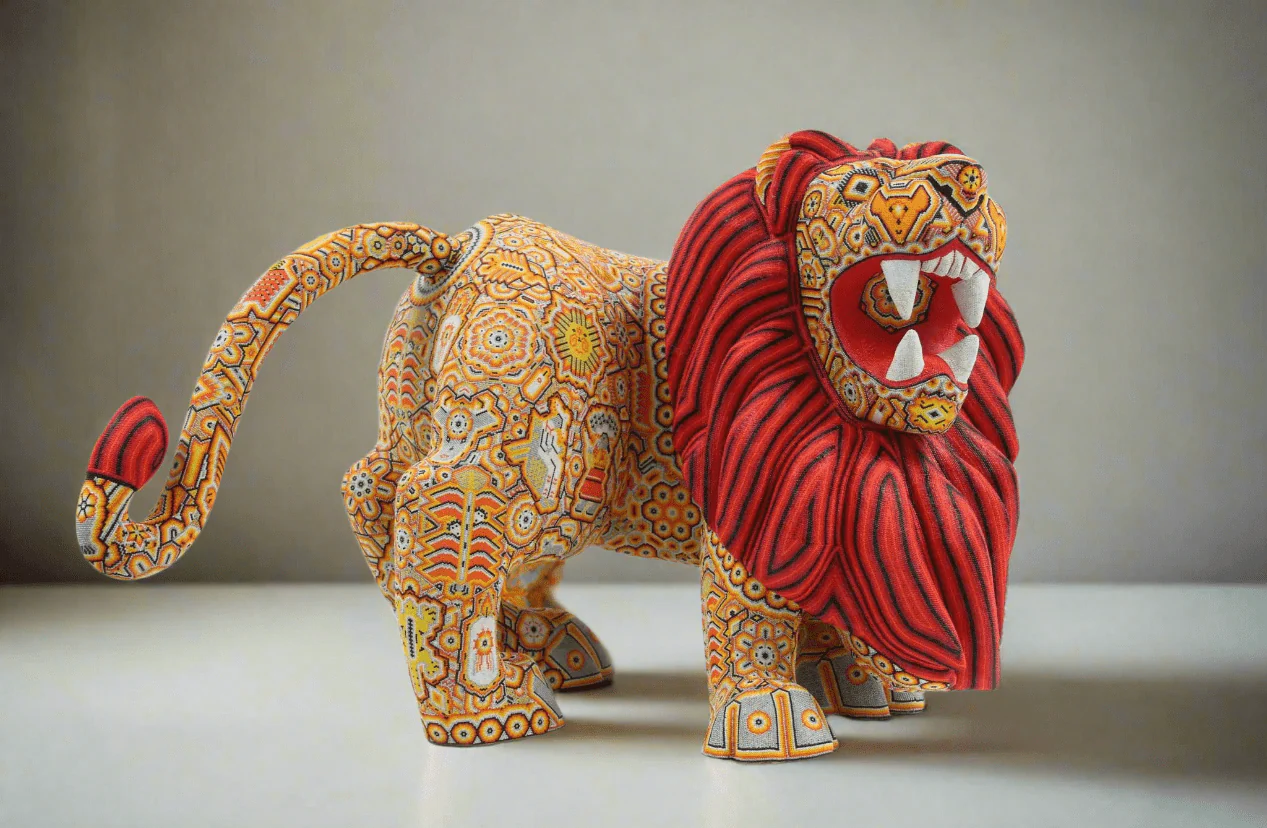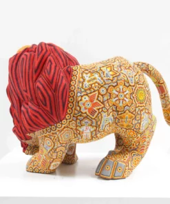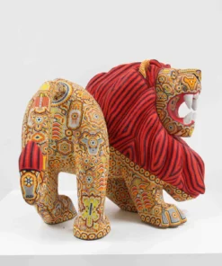 Esta obra maestra del arte Huichol destaca por su grandeza y dramatismo. La pieza está tallada con gran precisión y presenta al león rugiendo, lo que le da un toque de poder y energía.