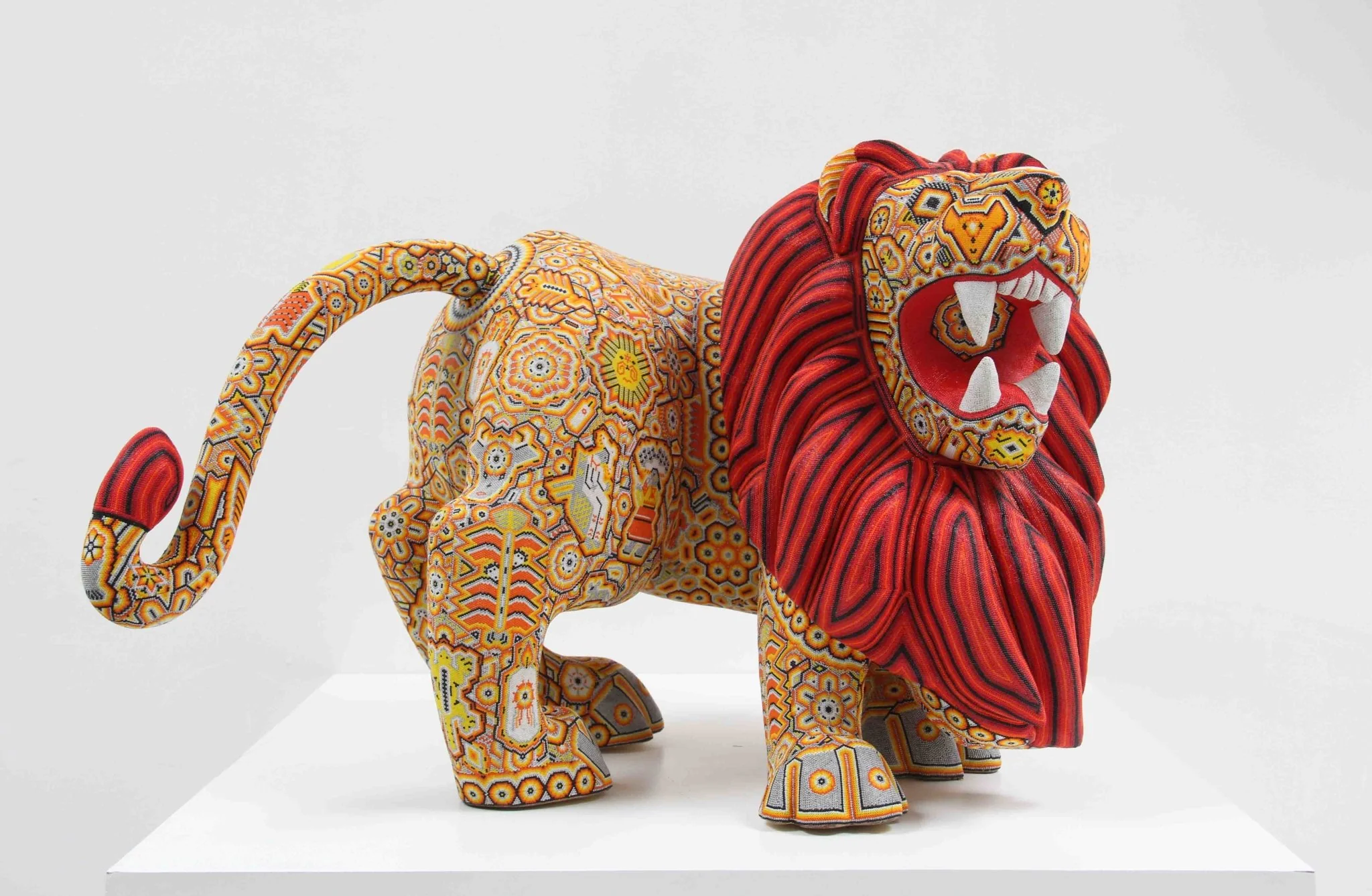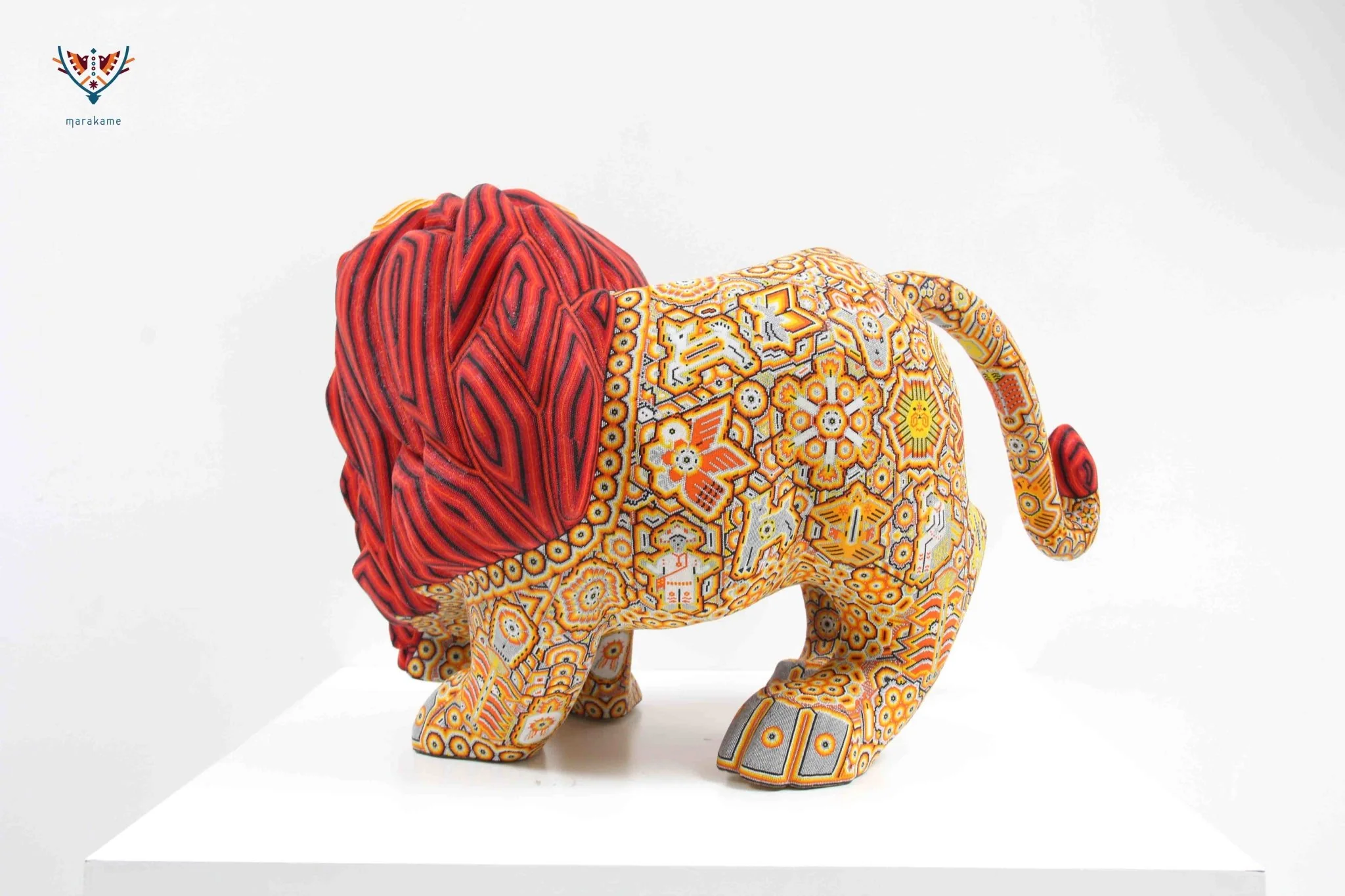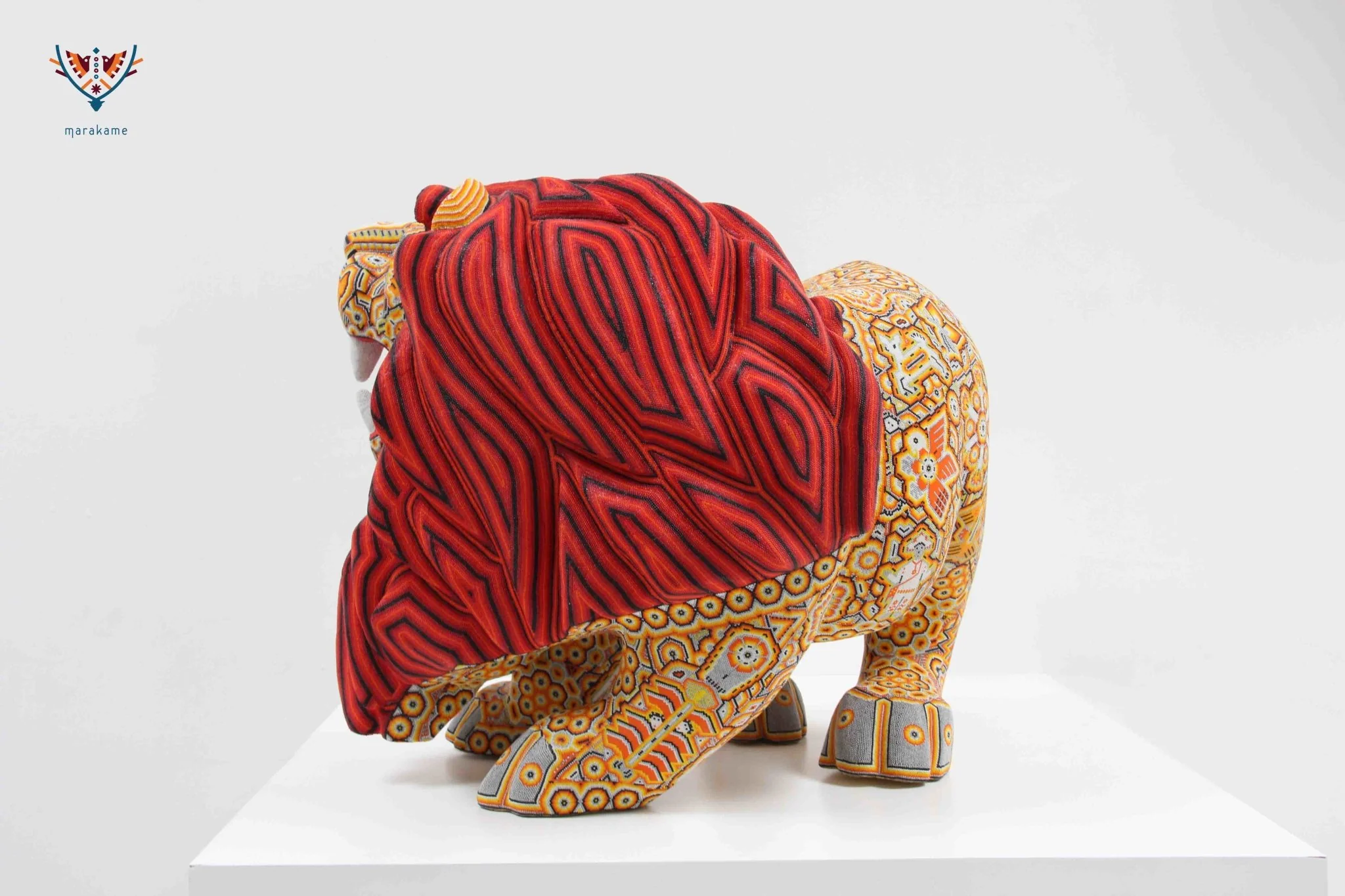 Esta obra maestra del arte Huichol destaca por su grandeza y dramatismo. La pieza está tallada con gran precisión y presenta al león rugiendo, lo que le da un toque de poder y energía.