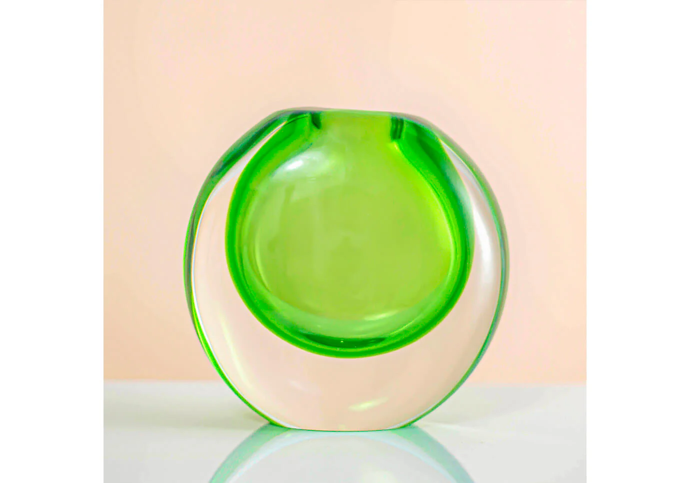 Florero de cristal translucido circular interior color verde.