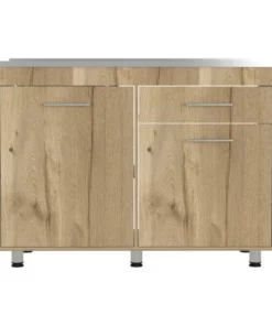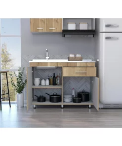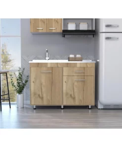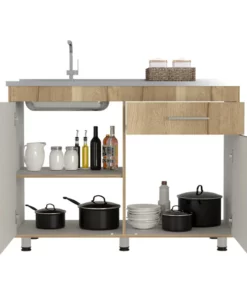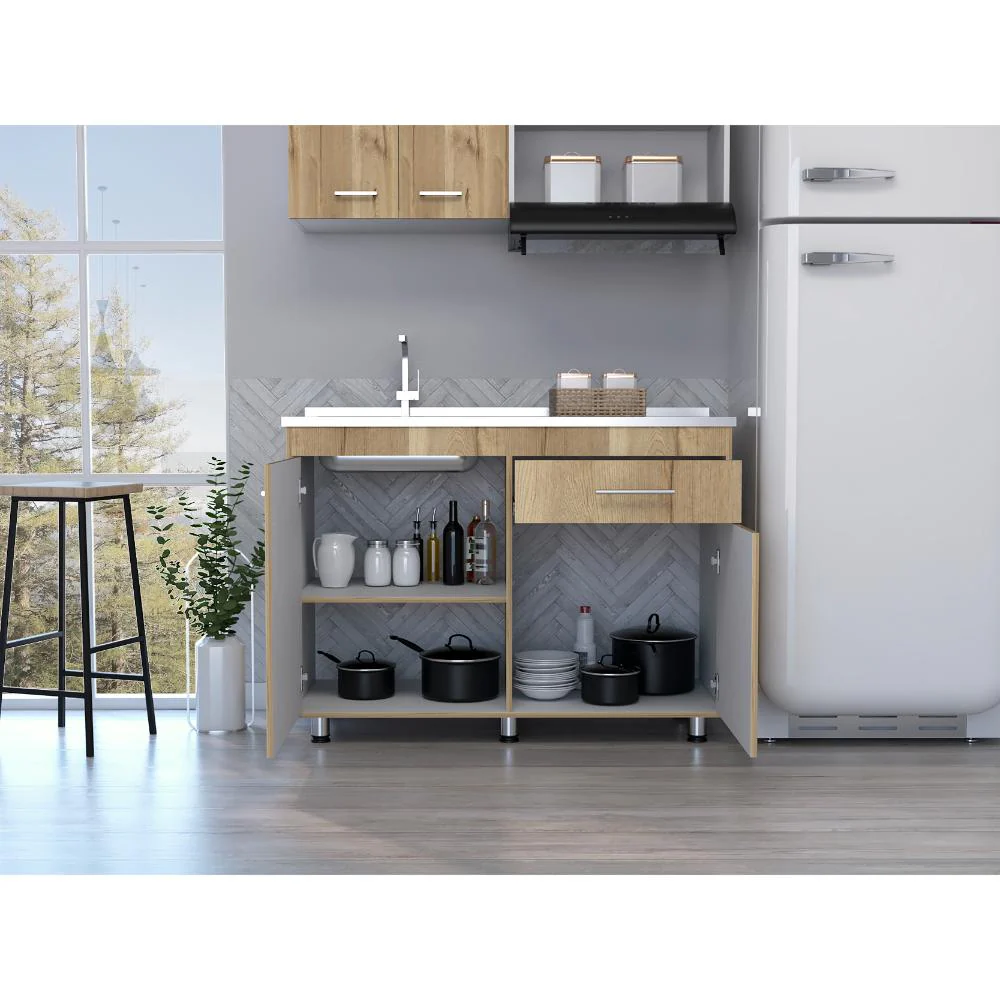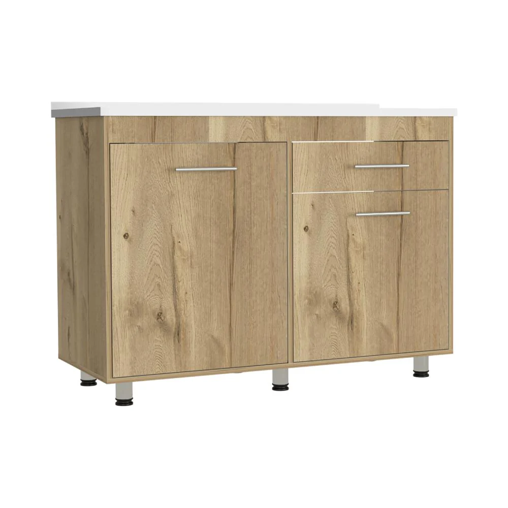Gabinete Inferior incluye meson izquierdo, manijas metálicas ,dos puertas abatibles y un cajón