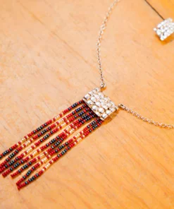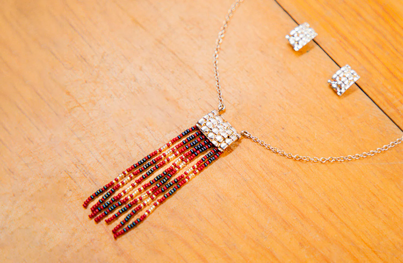 Juego de collar y aretes “Antonia” hecho de plata y chaquira, elaborados por artesanos mexicanos del estado de Jalisco.
