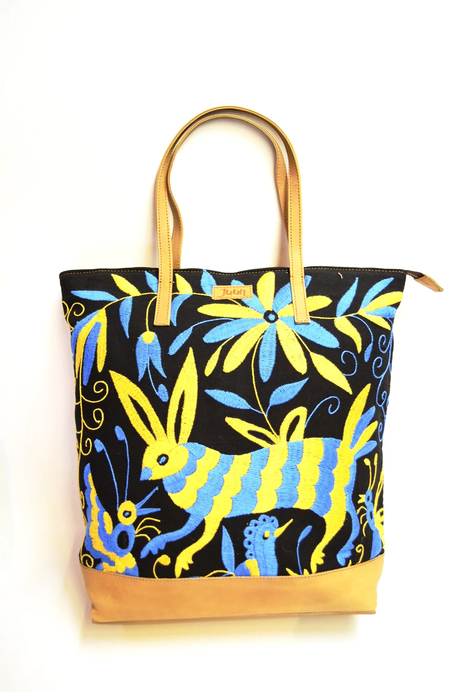 Materiales: Textil bordado otomí artesanal sobre manta negra cruda, piel vacuna de curtido vegetal (sin procesos tóxicos) y cierre metalizado.