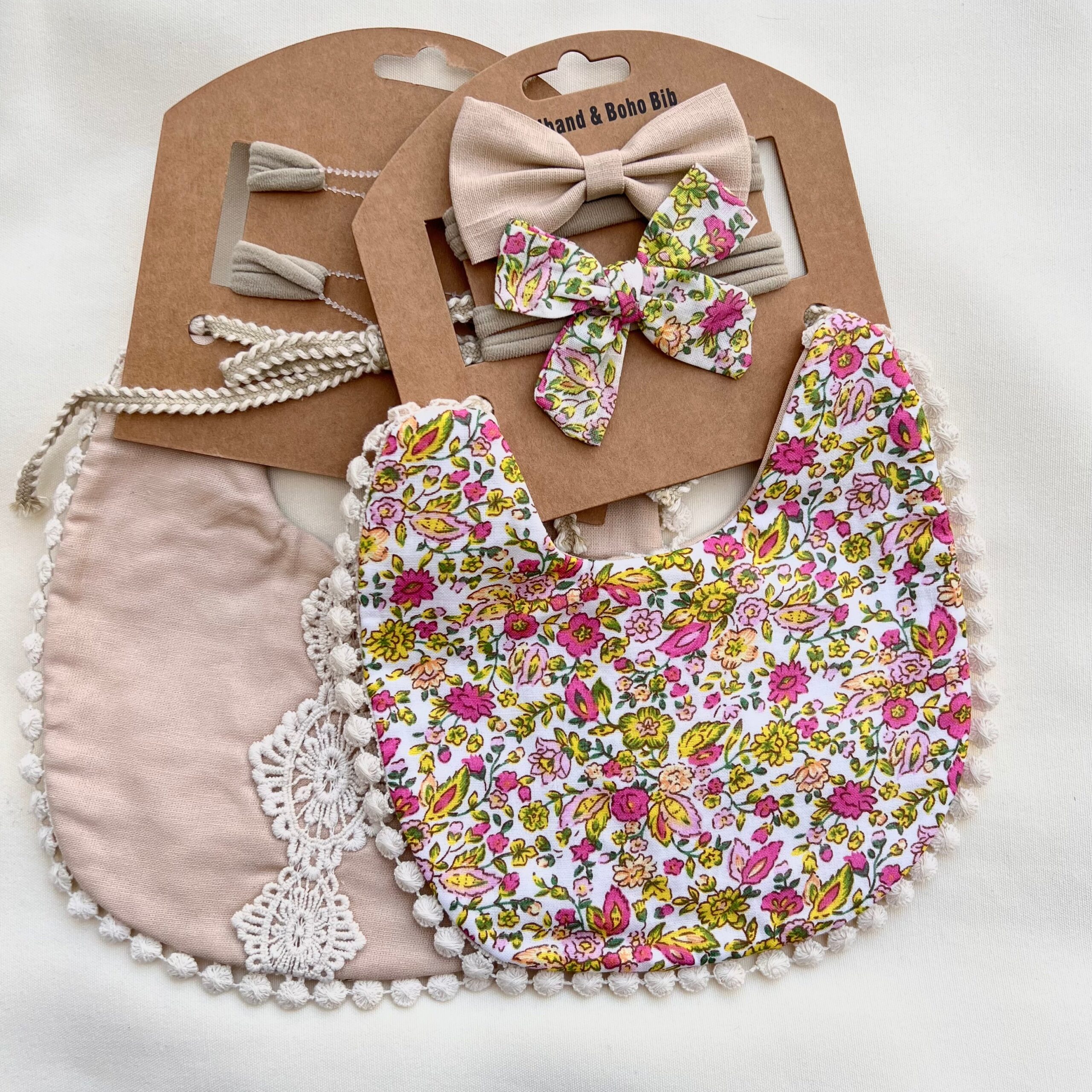 KIT MOÑOS Y BABERO FLORECITAS ROSAS CON HOJAS Y ENCAJE COLOR PIEL