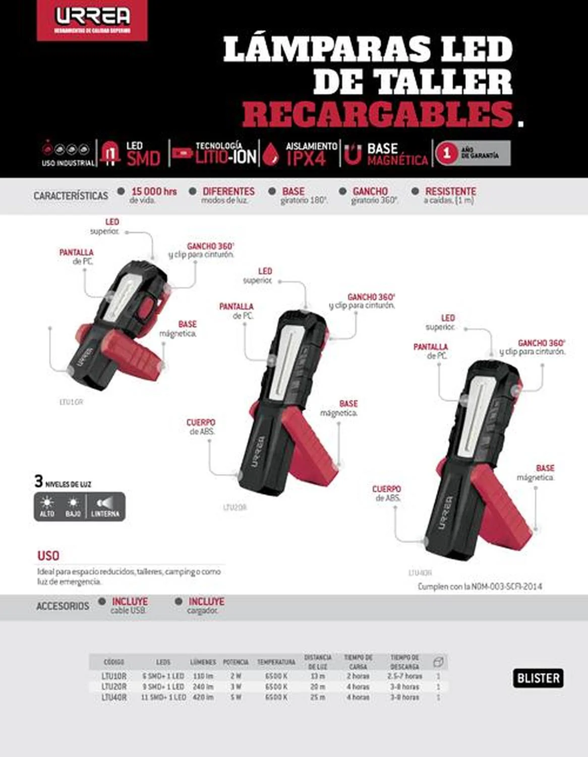 MARCA: Urrea DESCRIPCION DEL PRODUCTO: -420 lúmenes, temperatura 6500k.-25 metros de distancia de luz, duración de carga 4 horas, duración de batería 3-8 horas.-Tecnología LED 9na generación. Mejor calidad de iluminación.-Cuerpo de ABS con recubrimiento de goma y pantalla de policarbonato. Bases magnéticas.-Indicadores de carga y descarga. Puertos micro USB.-Mantenimiento industrial, áreas automotrices, trabajos que requieran gran iluminación y versatilidad. ESPECIFICACIONES TECNICAS: CONTENIDO DEL PAQUETE: Lámpara, manual, centro de carga, cable USB. GARANTIA: 1 año ALTO EN CM: 27 LARGO EN CM: 17 FONDO EN CM: 17 PESO EN KG: 0.35