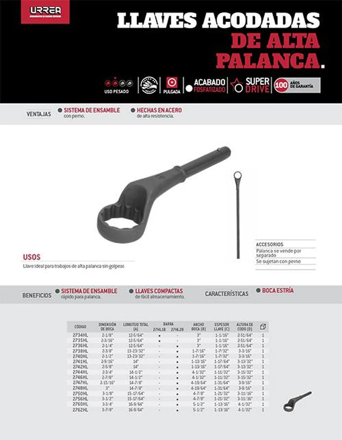 MARCA: Urrea DESCRIPCION DEL PRODUCTO: -Tipo de boca estriada, dimensión de boca: 2-3/16″, longitud total: 12-5/64″, ancho de boca: 3″.-Espesor de la llave: 1-1/16″. Altura de codo: 2-51/64″. Compatible con Maneral: 27HL1B.-Acabado Fosfatizado.-Su diseño le permite generar un óptimo torque sin posibilidad de generar alguna lesión al usuario por la liberación de la llave.-Boca de estrías de pared gruesa, para soportar grandes torques.-Estas llaves permiten trabajar en posición vertical y horizontal en lugares de difícil acceso. ESPECIFICACIONES TECNICAS: CONTENIDO DEL PAQUETE: Llave estrías alta palanca 2-3/16 GARANTIA: 100 años ALTO EN CM: 8 LARGO EN CM: 31 FONDO EN CM: 8 PESO EN KG: 1.608