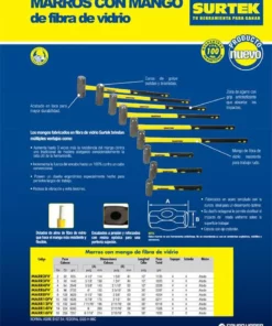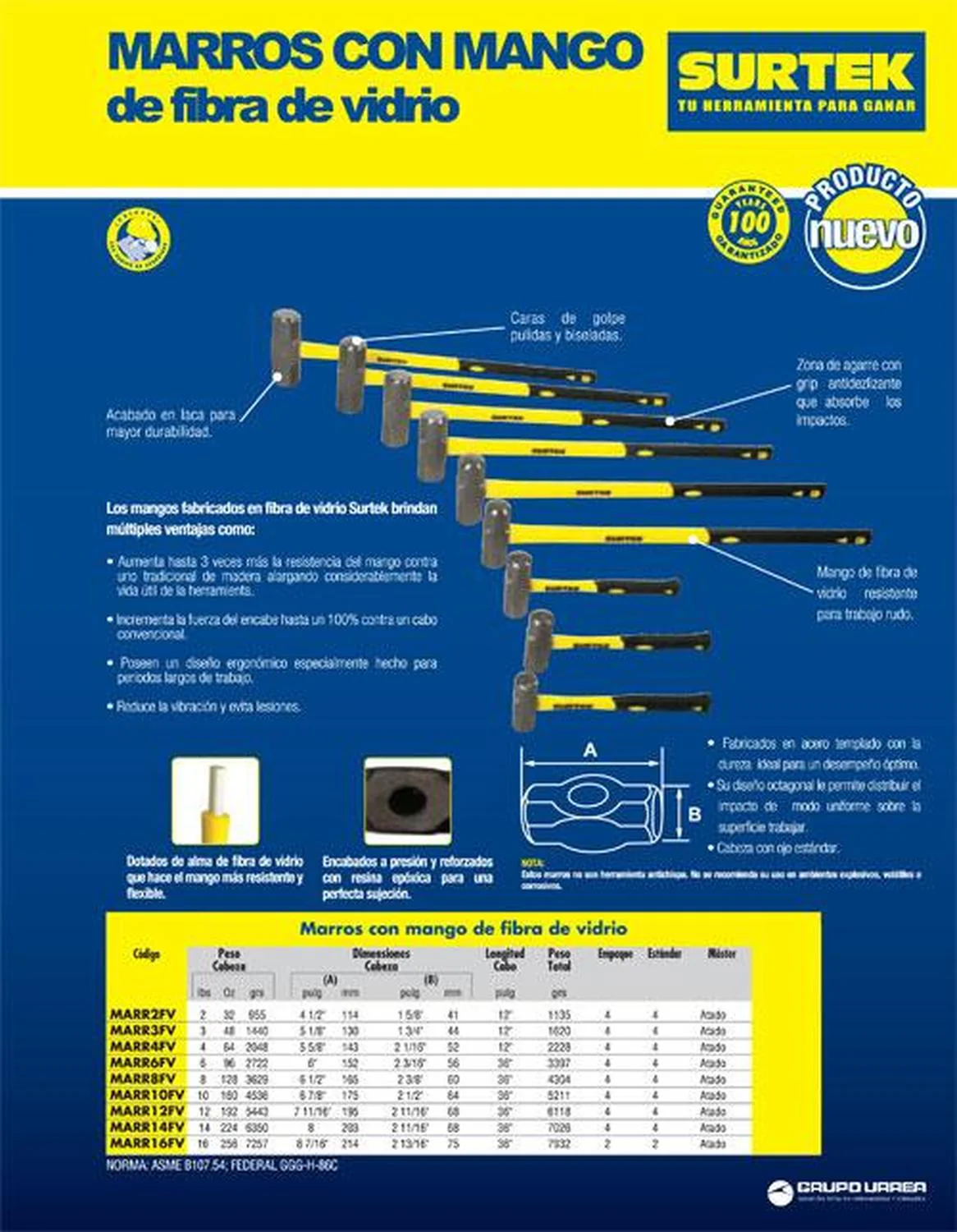 MARCA: Surtek DESCRIPCION DEL PRODUCTO: -Marro de acero octagonal 3lb mango fibra de vidrio Surtek-Cabezas octogonales forjadas en acero al alto carbón con doble tratamiento térmico-Mango de 12″-Marca Surtek ESPECIFICACIONES TECNICAS: -Diámetro Cabeza: 1 3/4″-Longitud Cabeza: 5 1/8″-Longitud Total: 12″-Material De Mango: Fibra De Vidrio-Peso Cabeza: 3Lb CONTENIDO DEL PAQUETE: Marro de acero octagonal 3lb mango fibra de vidrio Surtek GARANTIA: ALTO EN CM: 4 LARGO EN CM: 12 FONDO EN CM: 34.5 PESO EN KG: 1.467