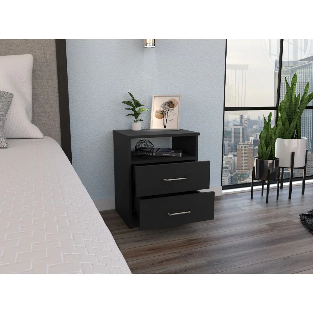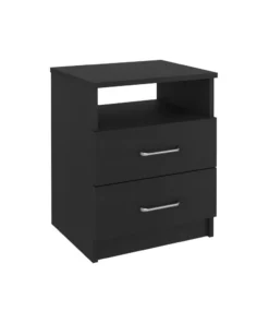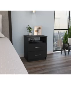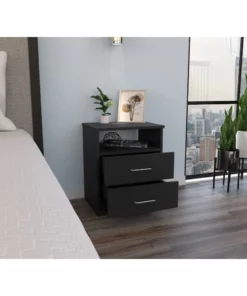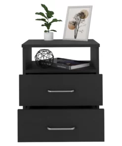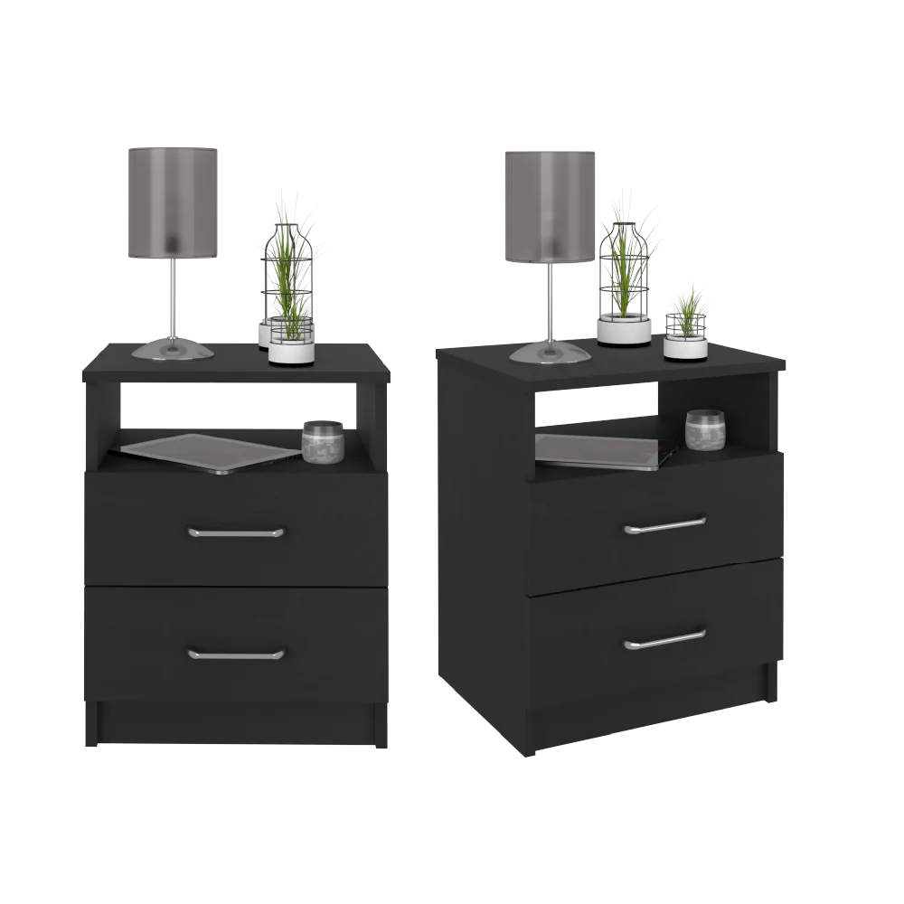 Mesa de Noche x2, con diseño practico y funcional, espacio para colocar objetos decorativos, dos (2) cajones, fácil armado e instalación incluye manual de armado.
