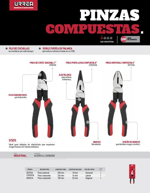 Pinza con mango bimaterial palanca compuesta de 8″ punta larga Urrea