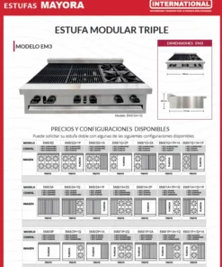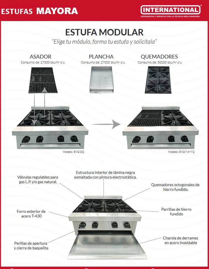 QUEMADORES OCTOGONALES DE HIERRO FUNDIDO.- PARRILLAS DE HIERRO FUNDIDO.- ESTRUCTURA INTERIOR DE LÁMINA NEGRA ESMALTADA CON PINTURA ELECTROSTÁTICA.- FORRO EXTERIOR DE ACERO INOX- VÁLVULAS PARA GAS L.P.- PERILLAS DE APERTURA Y CIERRE DE BAQUELITA.- CHAROLA DE DERRAMES EN LÁMINA GALVANIZADA.- CONSUMO DE QUEMADORES: 30000 BTU/HR C/U- CONSUMO DE ASADOR: 27000 BTU/HR C/U- CONSUMO DE PLANCHA: 27000 BTU/HR C/ MEDIDAS: FRENTE 90 cm FONDO 64.3 cm ANCHO 28.7 cm