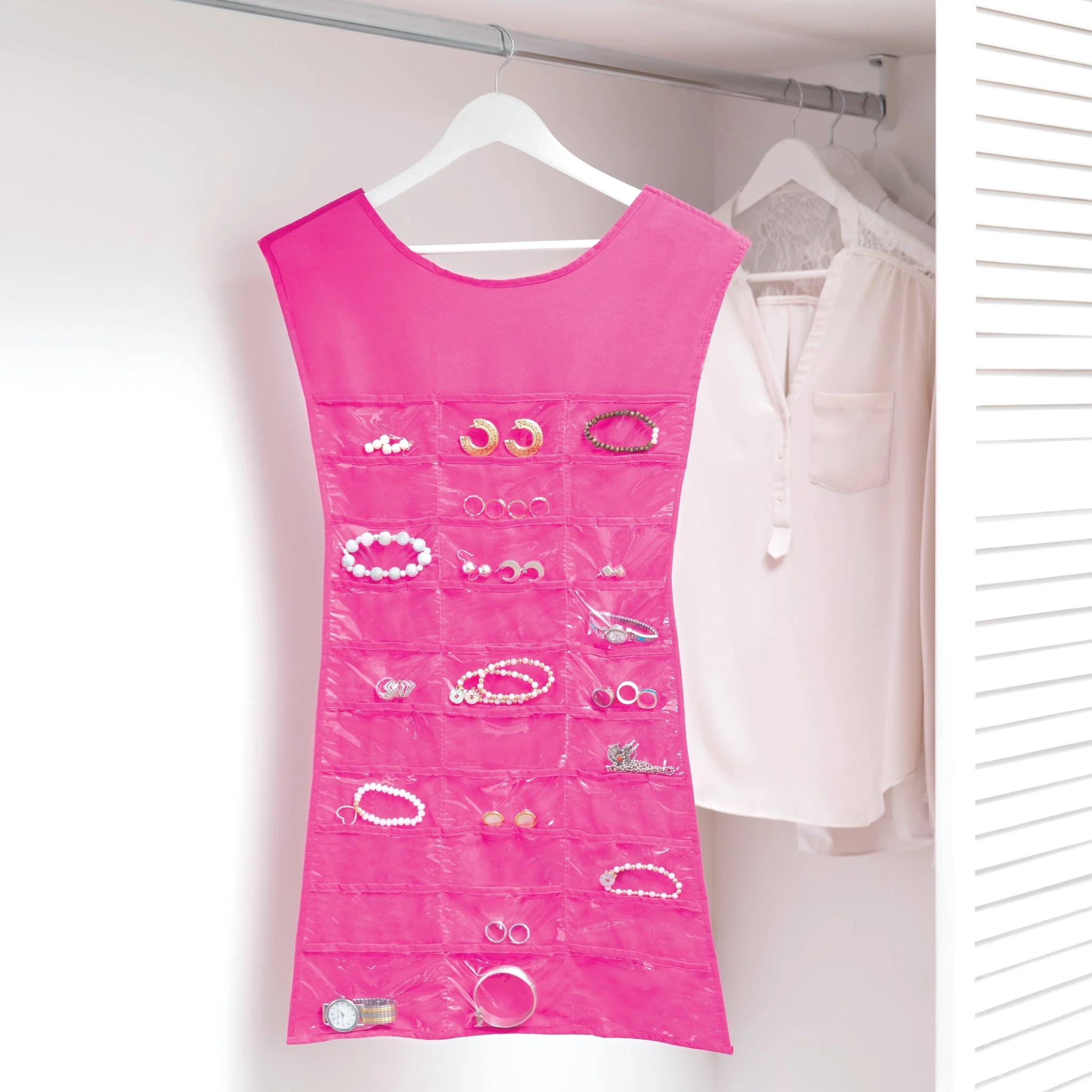 Better Teen tiene la mejor solución para que organices tus accesorios con Vestido Joyero Pink que cuenta con 30 compartimientos para accesorios como pulseras, anillos, aretes, relojes, dijes y prendedores. Además cuenta con 14 ganchos para colgar collares o pulseras.